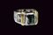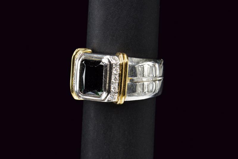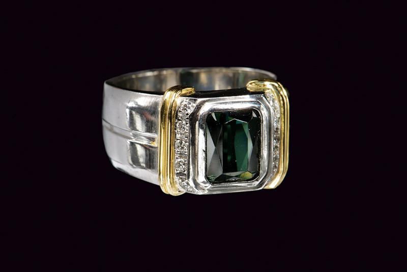 Anello da uomo realizzato in platino con bande in oro giallo, al centro una tormalina verde taglio cuscino da 2.5 ct con ai lati diamanti taglio brillante per un peso complessivo stimato di 0.15 ct ca. Misura 17, peso 26,40 gr