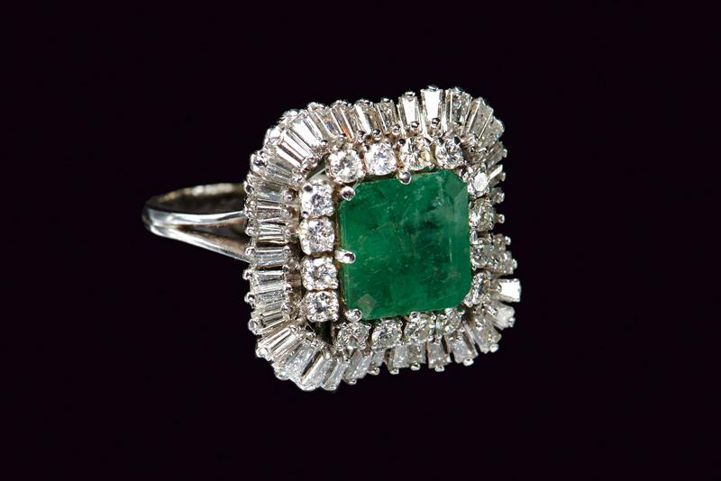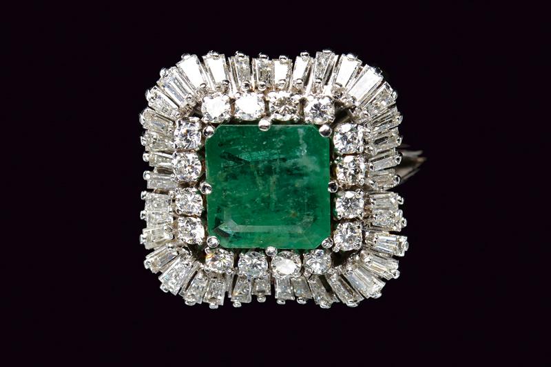 Anello in oro bianco 750/000 con smeraldo centrale carré di 4.0 ct ca con contorno di diamanti taglio brillante e baguette per un totale di 3.0 ct ca. Misura 18, peso 7,40 gr