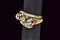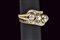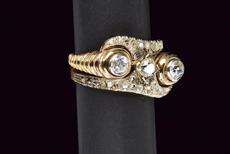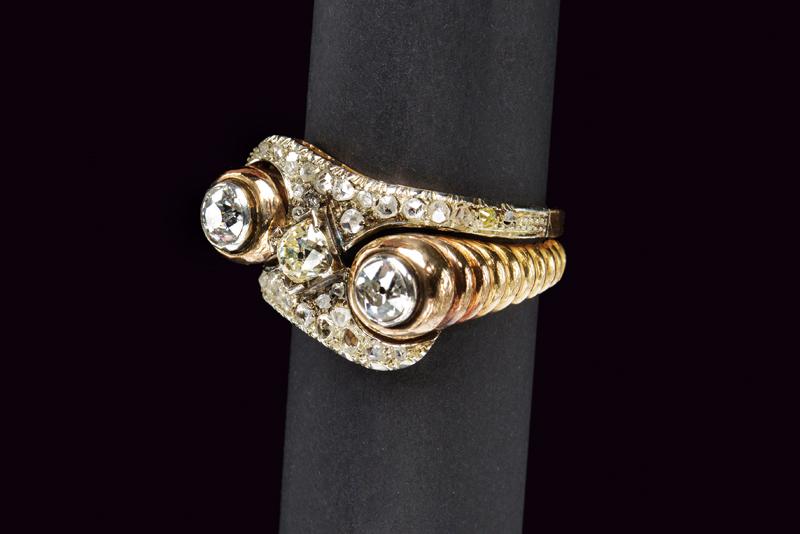Particolare anello realizzato in oro rosa e bianco con diamante taglio vecchia miniera centrale affiancato da due diamanti taglio vecchio e rosette a contorno per un peso totale stimato dei diamanti di 1.50 ct, misura 22, peso 14,8 gr