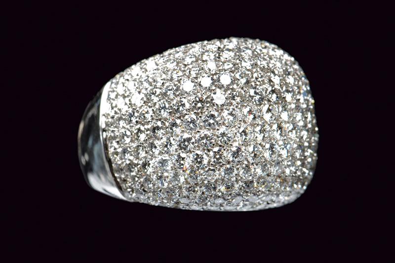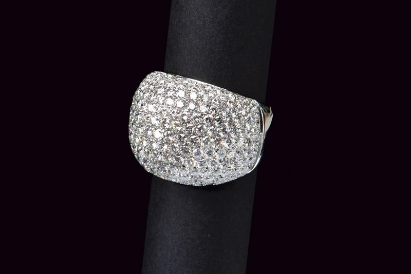 Anello a fascia in oro bianco 750/000 con fronte impreziosito da un pavé di 224 diamanti taglio brillante per un peso totale di 4.53 ct. misura 12, Peso 13,5 gr