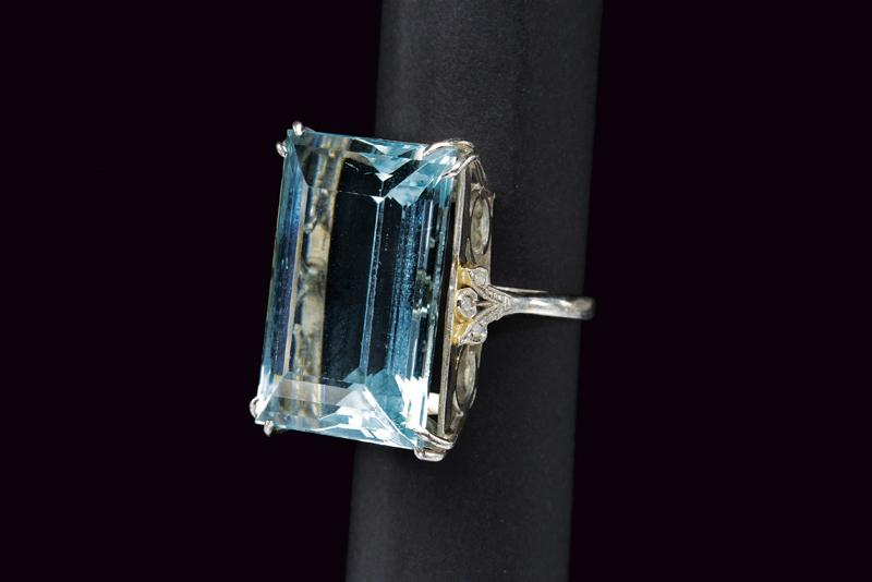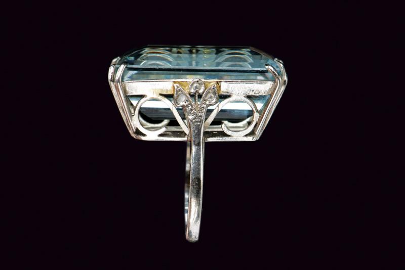Anello in platino con acquamarina centrale e diamanti. L'acquamarina di 30.0 ct ha taglio rettangolare e misura mm 22 x 15, piccoli diamanti laterali taglio rosetta. Misura 12, peso 13 gr