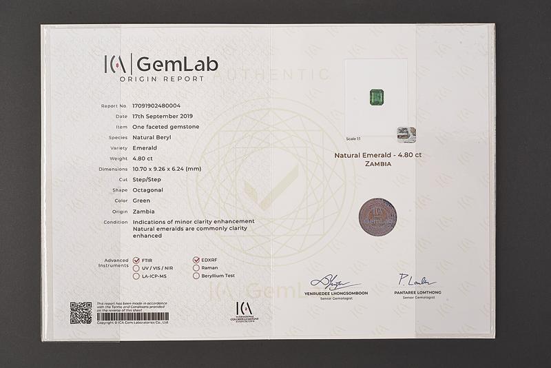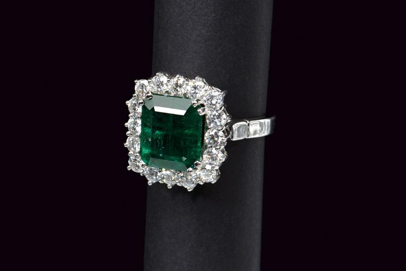 Anello realizzato in oro bianco 750/000 con al centro uno smeraldo naturale di forma ottagonale step-cut origine Zambia da 4.80 ct corredato da certificato ICA GemLab nr.17091902480004, contornato da 16 diamanti taglio brillante per un totale di 1.5 cts. Misura 15, peso 8,2 gr