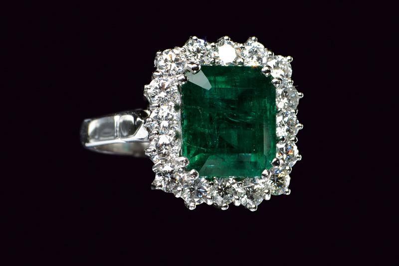 Anello in oro bianco, smeraldo naturale da 4.80 ct e diamanti