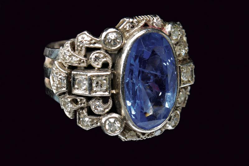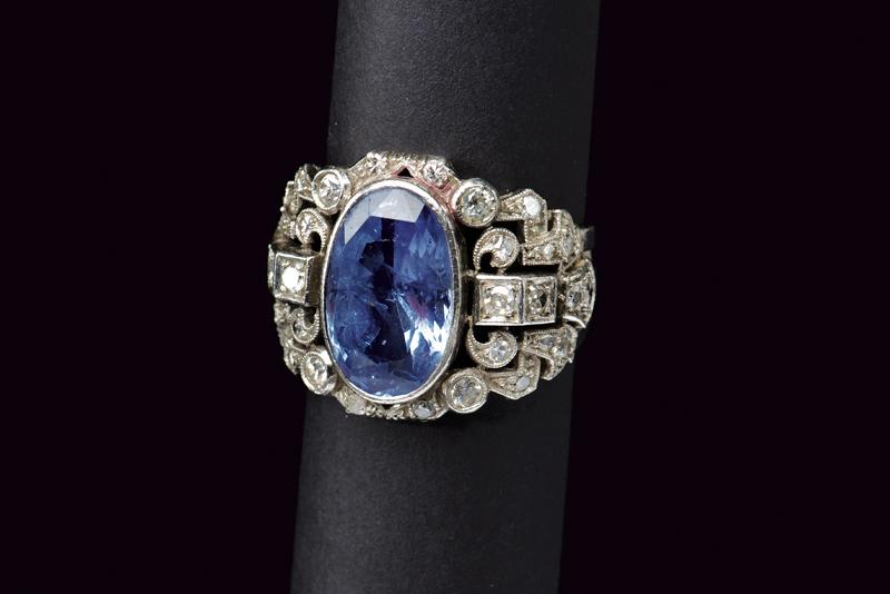 Importante anello in platino, e diamanti con zaffiro Sri Lanka da 6.50 ct
