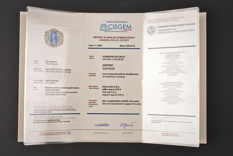 Importante anello in platino con zaffiro Sri Lanka ovale sfaccettato blu trasparente naturale senza indicazioni di riscaldamento da 6.50 ct in contorno di diamanti taglio huit -huit dal peso complessivo di circa 1.0 ct. Corredato da certificato gemmologico CISGEM nr. 15850 del 3 Marzo 2020. Misura 13, peso totale 10 gr.