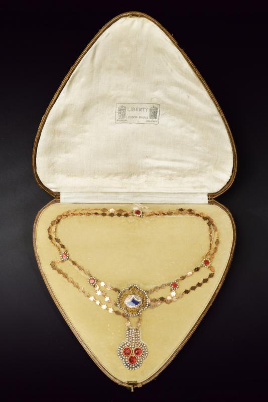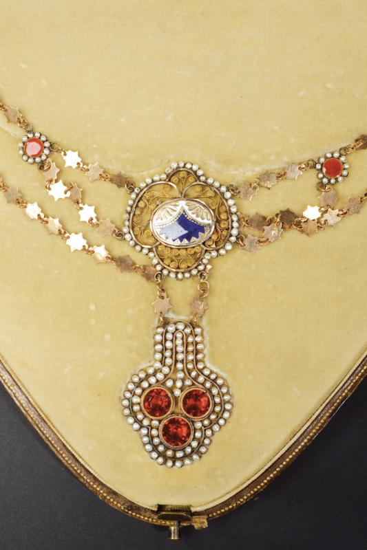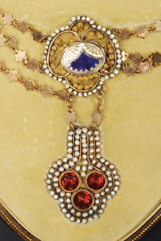 Antico collier con pendente realizzato in oro, smalti, microperle e vetri colorati, completo di astuccio originale. Peso 27,4 gr.