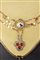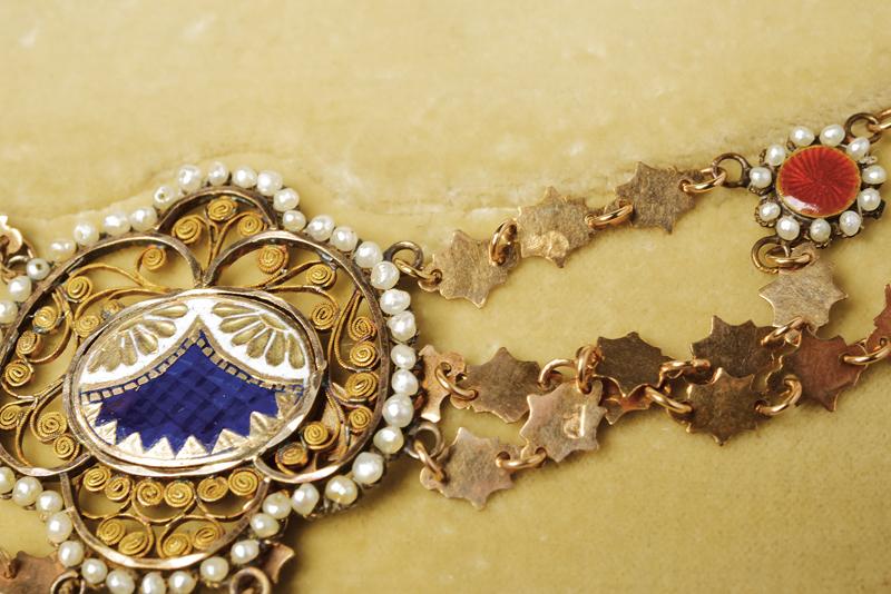 Antico collier con pendente realizzato in oro, smalti, microperle e vetri colorati