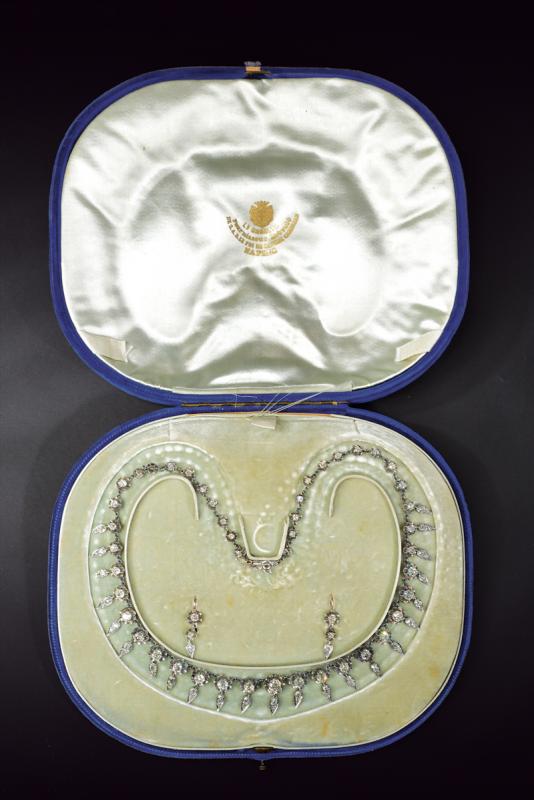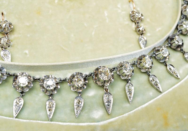 Demi parure composta da una bellissima collana riviere di diamanti in oro e argento impreziosita da quarantacinque diamanti taglio vecchia miniera a scalare con pendagli per un totale complessivo di 20.0 ct circa, lunghezza cm 40. Orecchini e-suite. Completa di scatola. Peso totale 35,4 gr