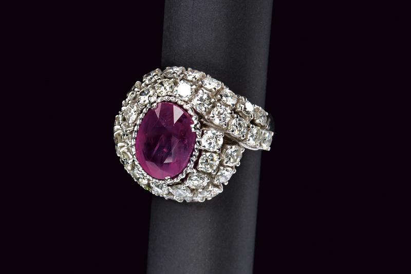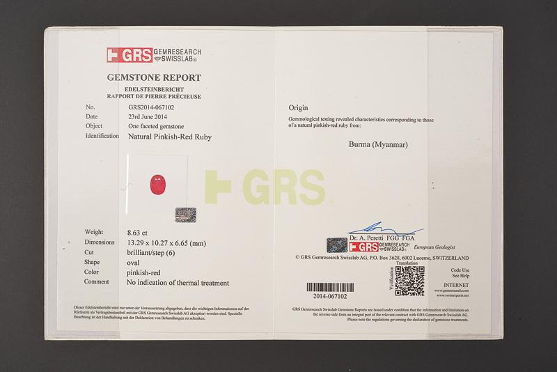 Importante anello in oro bianco 750/000 con rubino Burma ovale taglio brilliant step di 8.63 ct non trattato con contorno di diamanti taglio brillante per un totale di 5.7 ct ca. Corredato da certificato gemmologico GRS nr. 2014-067102 attestante le caratteristiche del rubino. Misura 16, peso 24 gr.