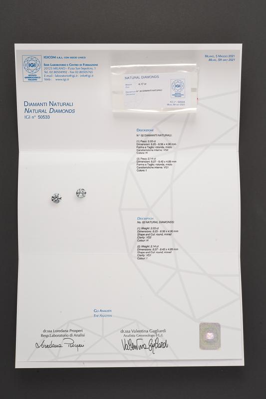 Anello contrarié in platino impreziosito agli apici da due diamanti taglio misto; uno di 2.03 ct colore H purezza VS2, l’altro di 2.14 ct, colore I purezza VS1 corredati di certificato I.G.I nr. 50533 attestante le caratteristiche. Ai lati diamanti taglio trapezio per un peso totale stimato di 0.90 ct. Astuccio originale. Misura 12, peso 6,55 gr