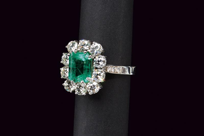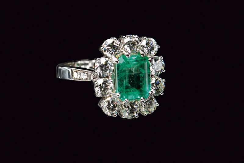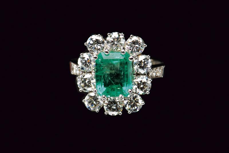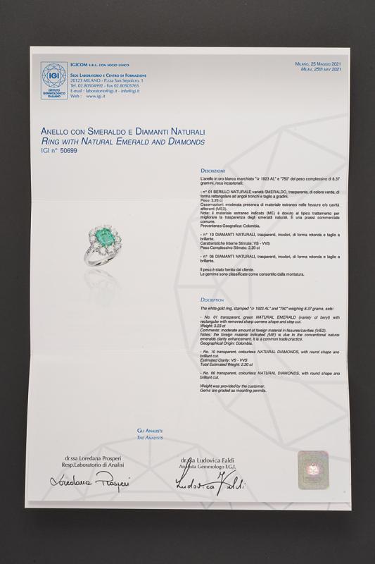Anello margherita in oro bianco 750/000 centrato da uno smeraldo colombiano trasparente di colore verde di forma rettangolare con taglio a gradini dal peso di 3.23 ct con contorno di dieci diamanti tondi taglio brillante del peso complessivo stimato di 2.20 ct. Ulteriori sei brillanti sul gambo. Corredato da certificato gemmologico IGI n.50699 del 25 Maggio 2021. Misura 15, peso 8,37 gr.
