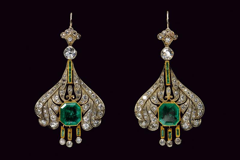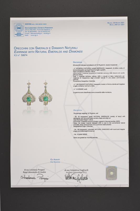 Un affascinante paio di orecchini a goccia Art Déco realizzati in oro bianco 750/000 impreziositi da centoventisei diamanti a taglio misto, brillante e huit-huit per un totale di 4.0 ct ca, centrati da due smeraldi verdi naturali trasparenti di forma ottagonale tagliati a gradini di origine colombiana del peso di circa 4.0 ct. Gli orecchini sono corredati da certificato gemmologico IGI nr. 50674 del 24 Maggio 2021. Peso 12,76 gr