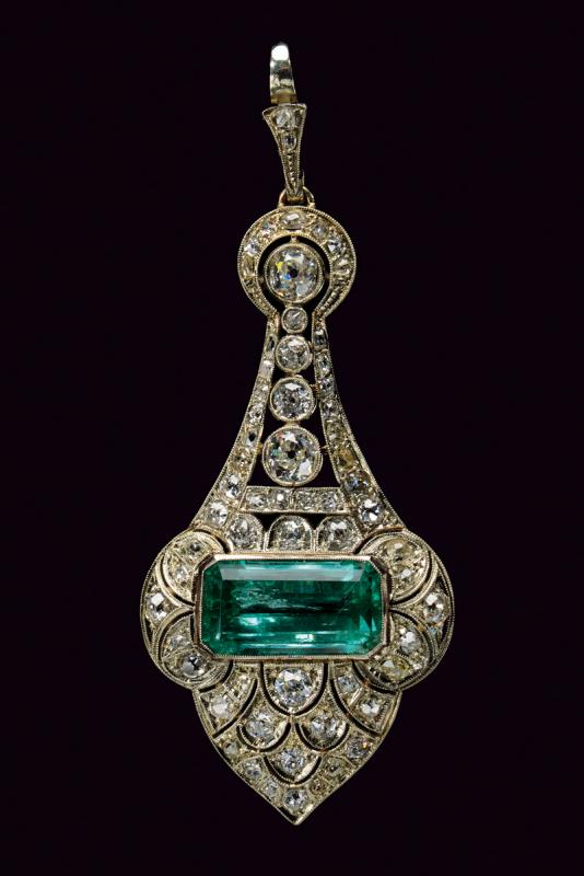 Pendente Art Deco con diamanti e smeraldo colombiano da 8.50 ct