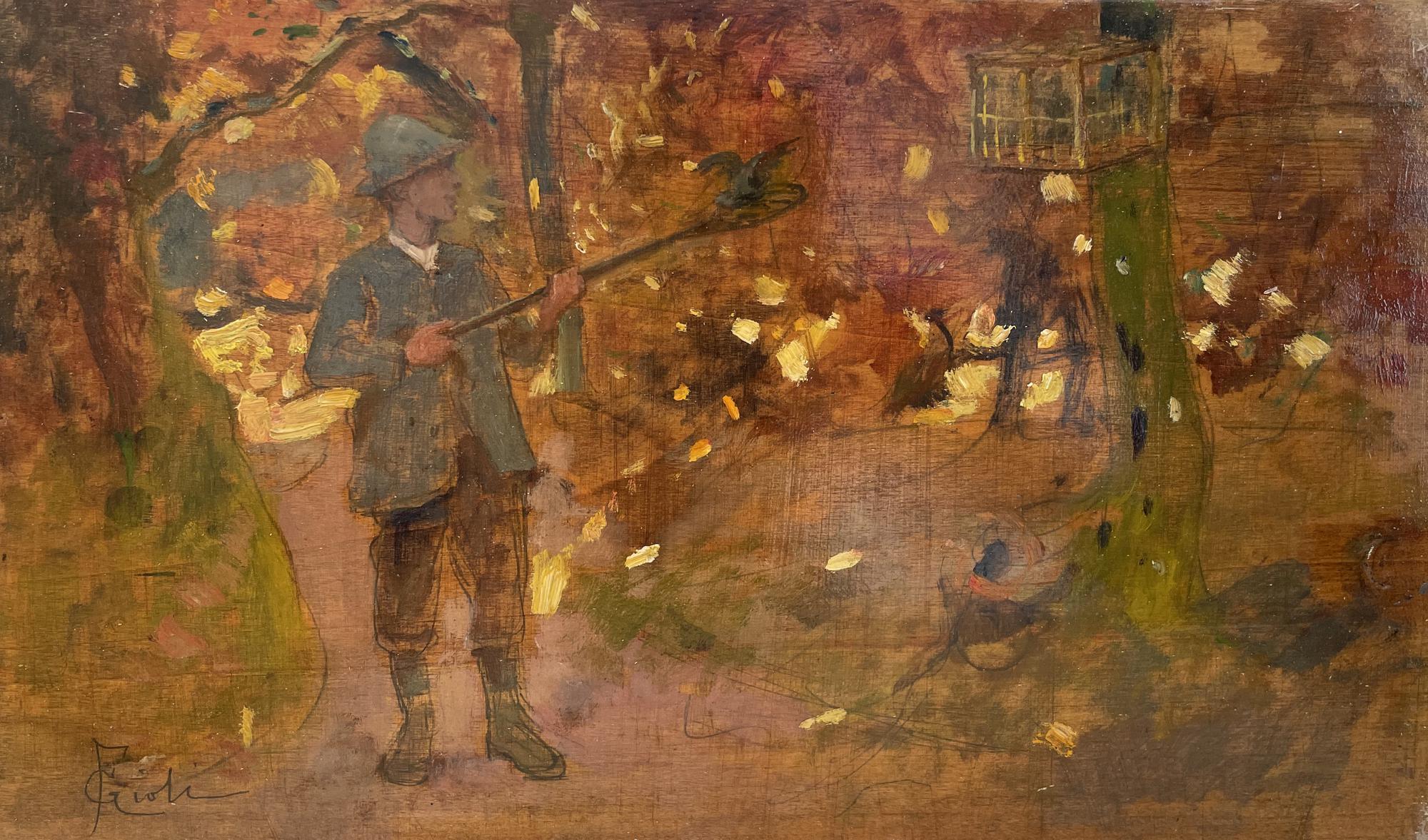 Francesco Gioli (1846 - 1922) CACCIATORE olio su tavola, cm 23x39...