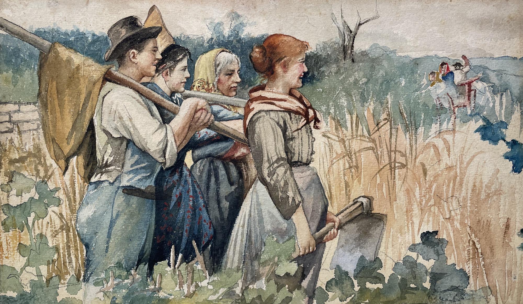 Egisto Ferroni (1835 - 1912) CONTADINI NEI CAMPI acquerello su cartone, cm...