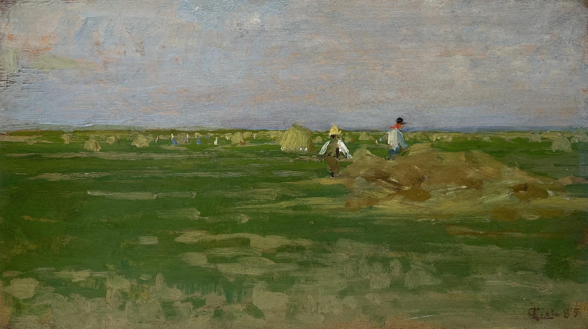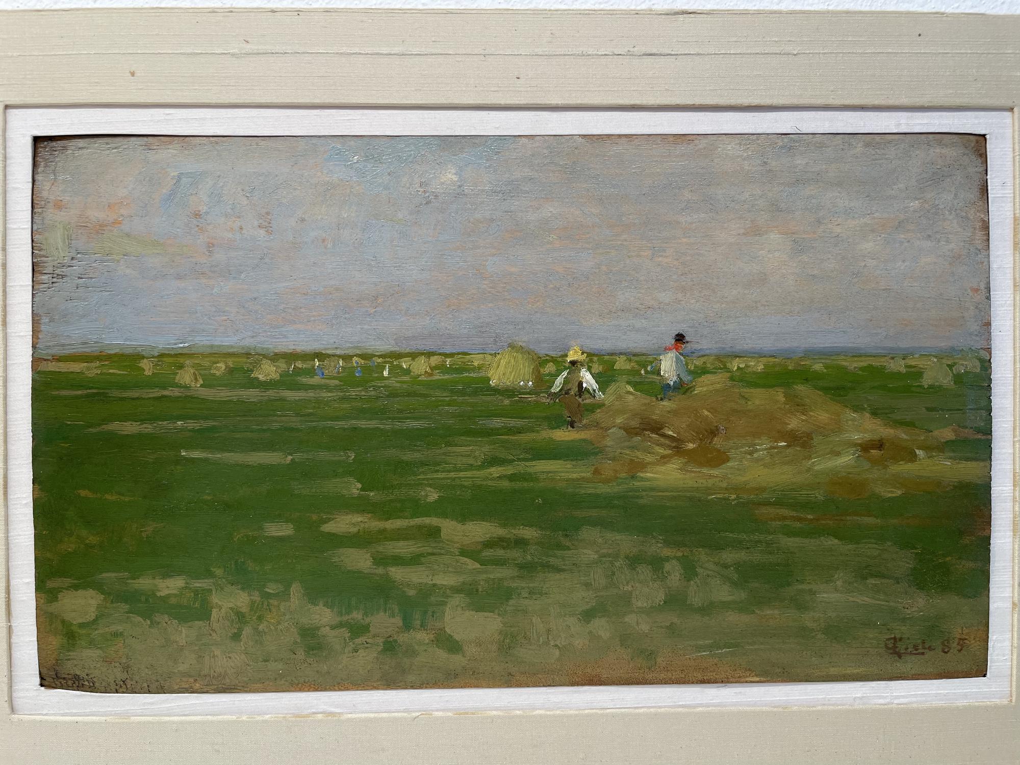 Luigi Gioli (1854 - 1947) LA RACCOLTA DEL FIENO olio su tavola, cm 18,5x32...