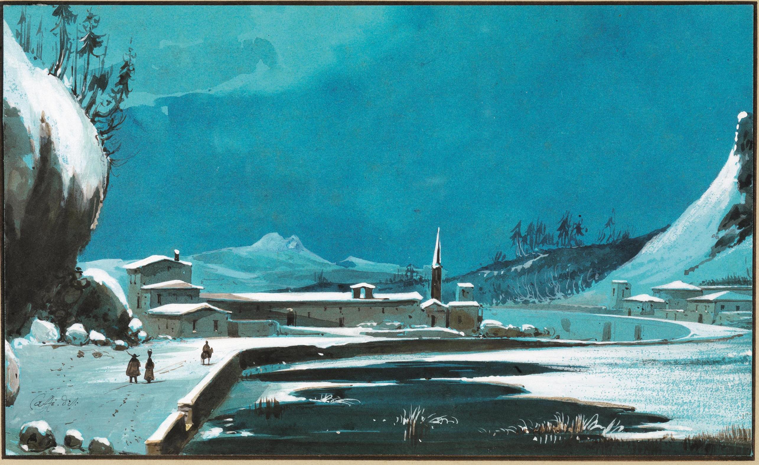 Ippolito Caffi(Belluno 1809 - Lissa 1866)VEDUTA ALPINA SOTTO LA NEVEtempera...