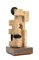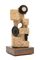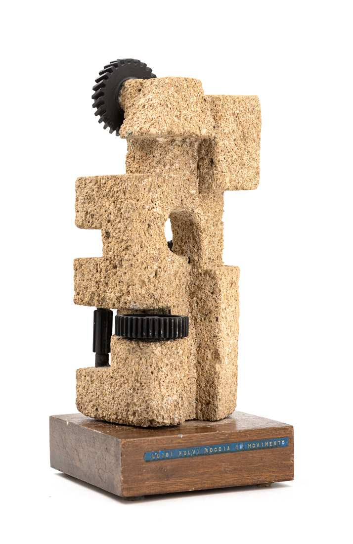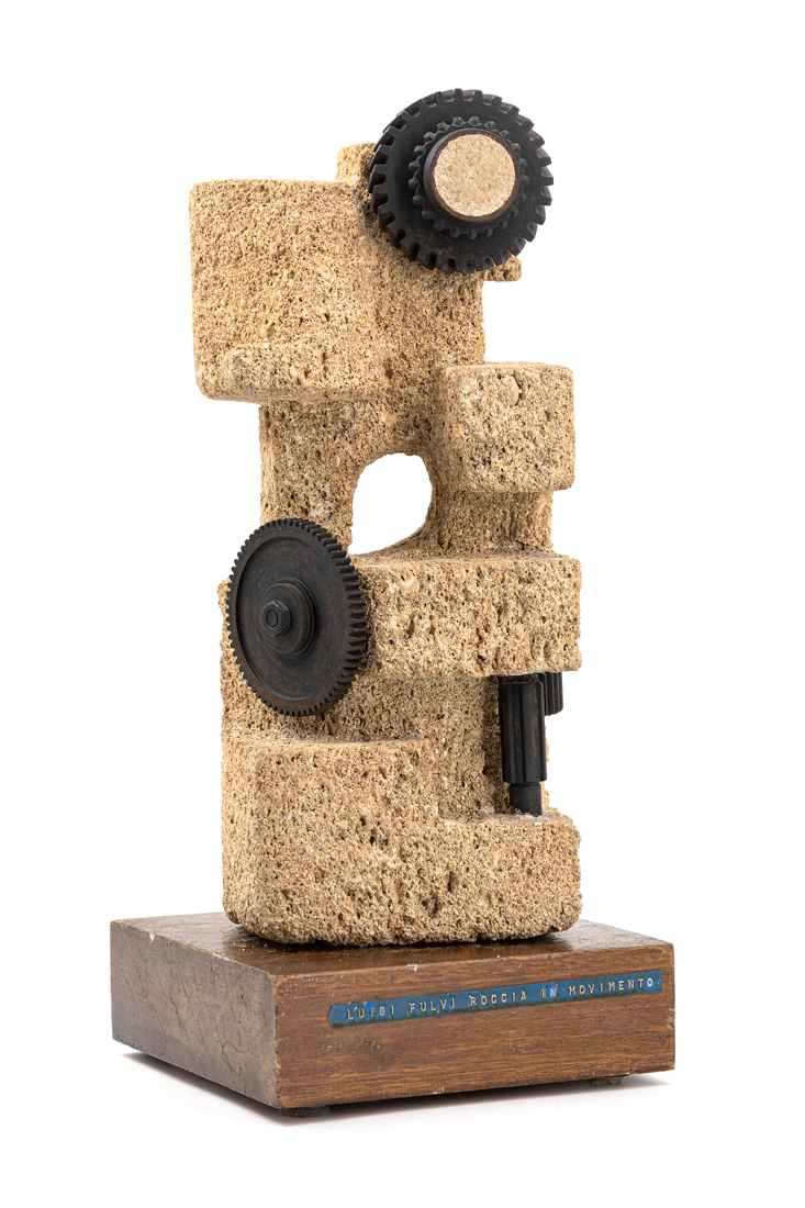Scultura in arenaria e ingranaggi in metallo poggiante su base in legno