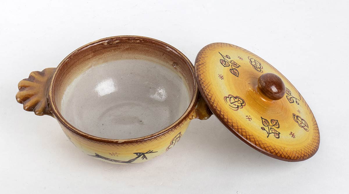 Tazza da brodo di colore giallo con decoro di animale e vegetazione stilizzati
