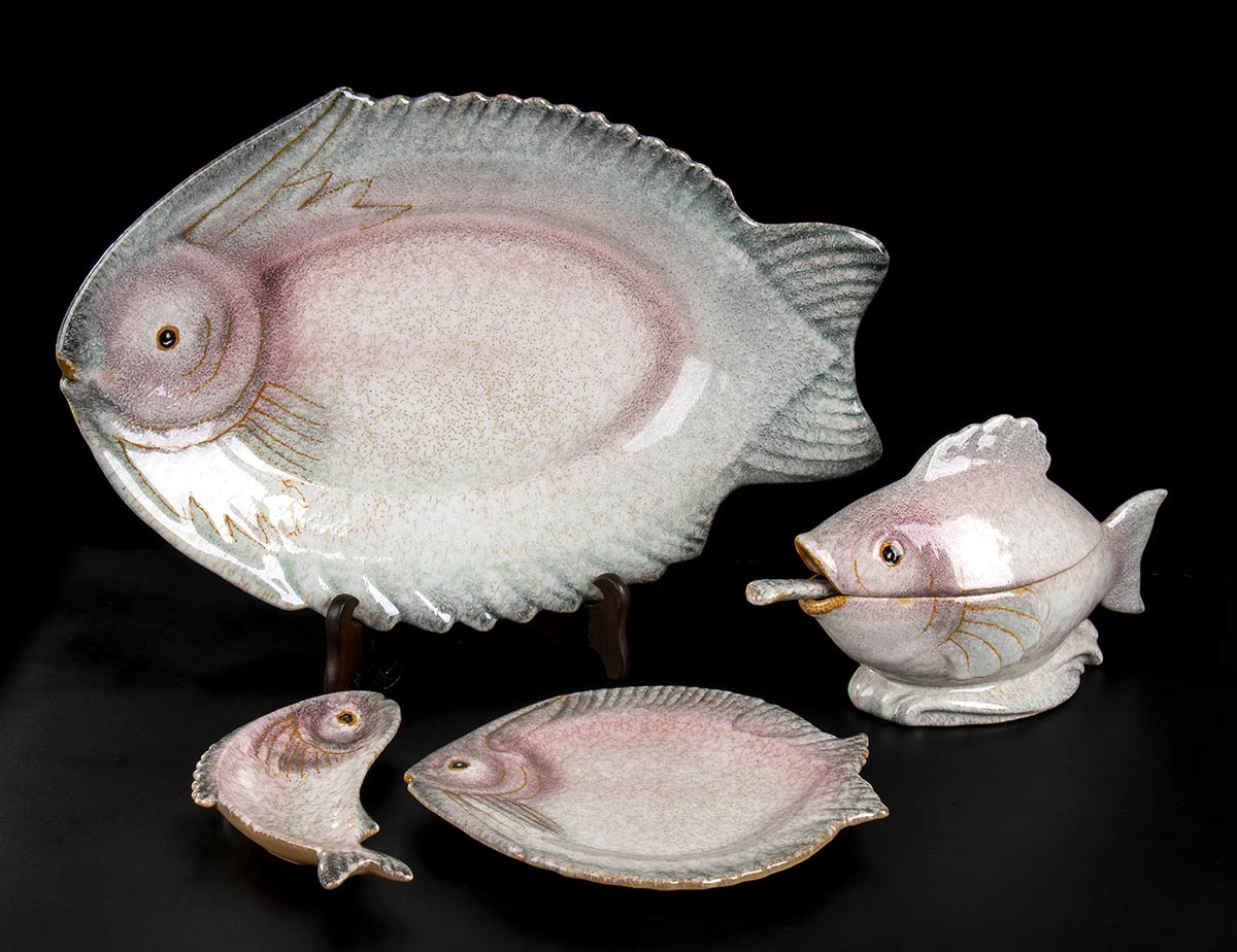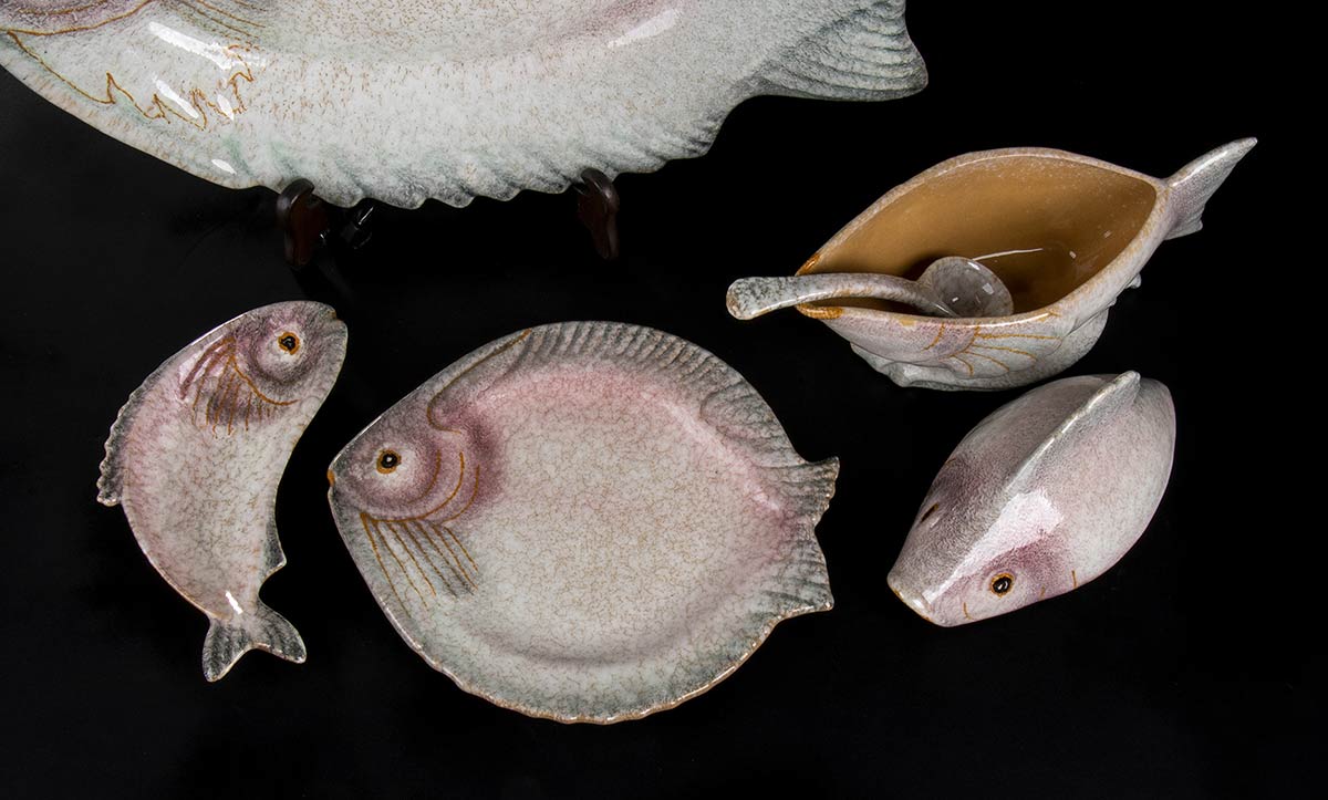 Servizio da sei da pesce, salsiera, vassoio, sei piatti e sei piattini