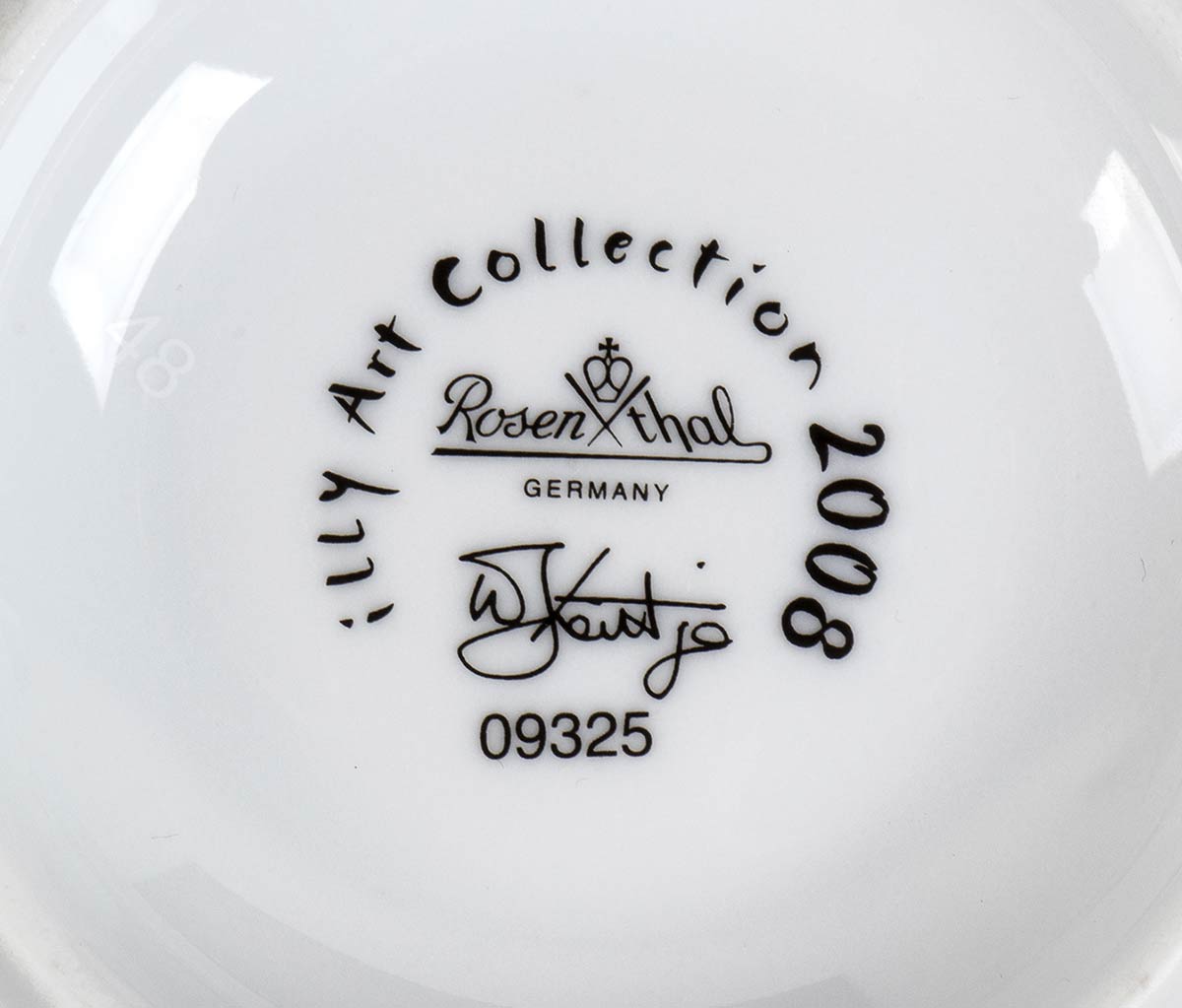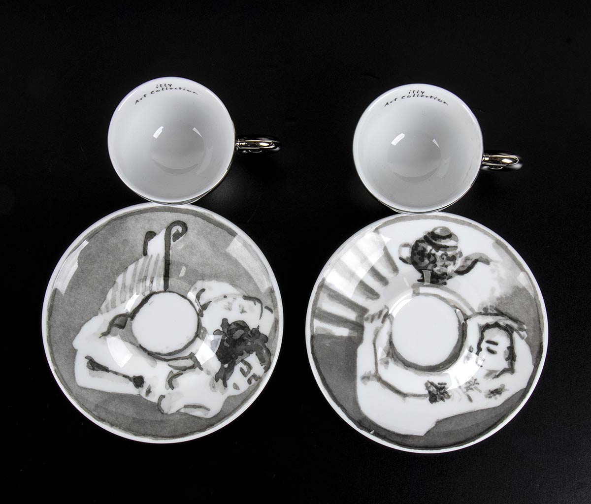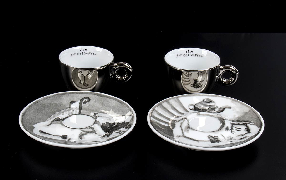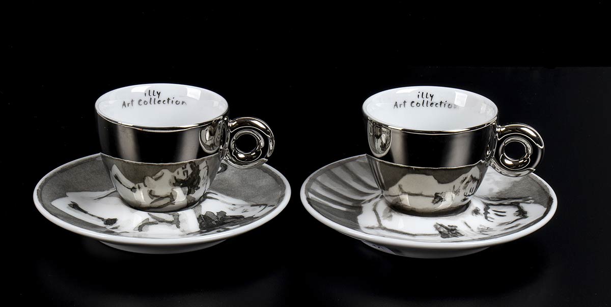 Servizio Illy Collection composto da due tazzine con piattini, il servizio presenta la particolarità di essere specchiante e di riflettere in maniera artistica la rappresentazione presente sul piattino