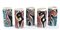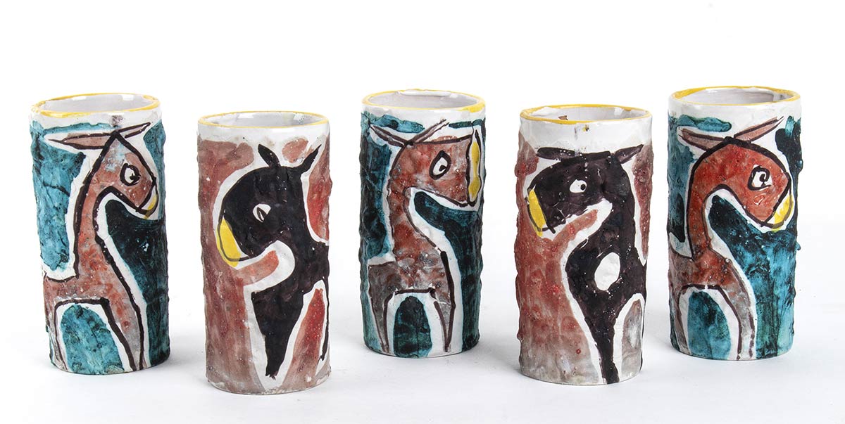 Cinque bicchieri di diversi colori: tre color petrolio e due color mattone