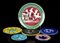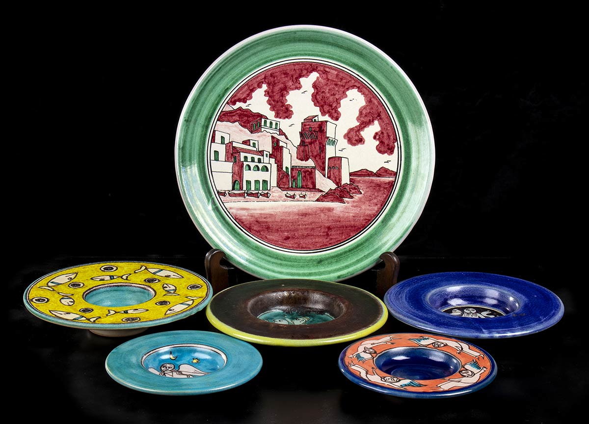 Posacenere di vari colori e un piatto color verde con decoro di una città rossa