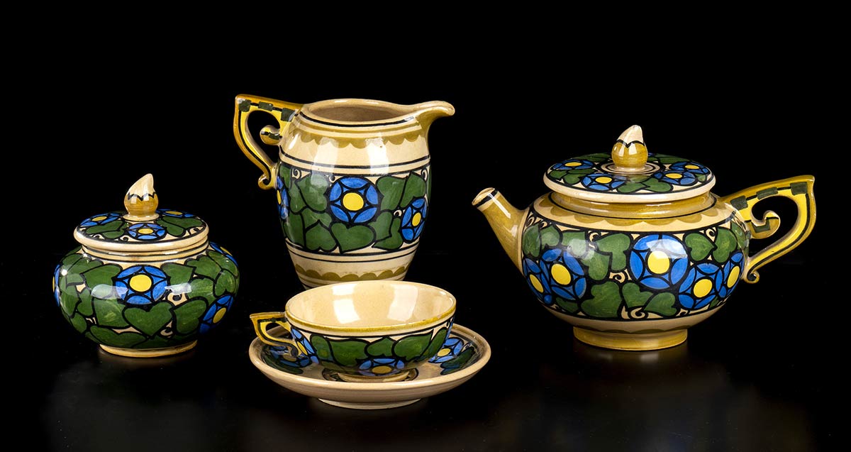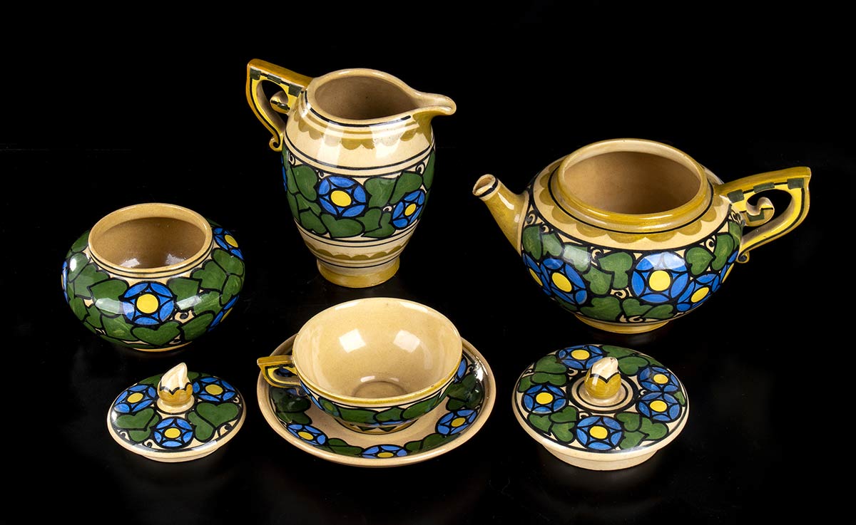 Servizio composto da: 6 tazzine con piattini, teiera, zuccheriera e lattiera