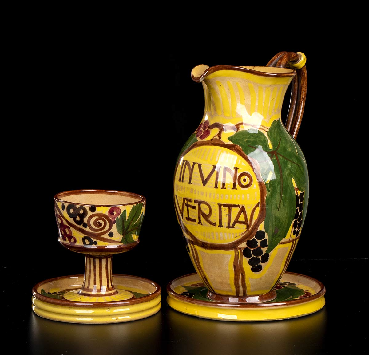 Servizio da vino composto da: una brocca, cinque calici e sette piattini