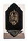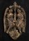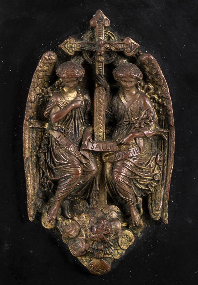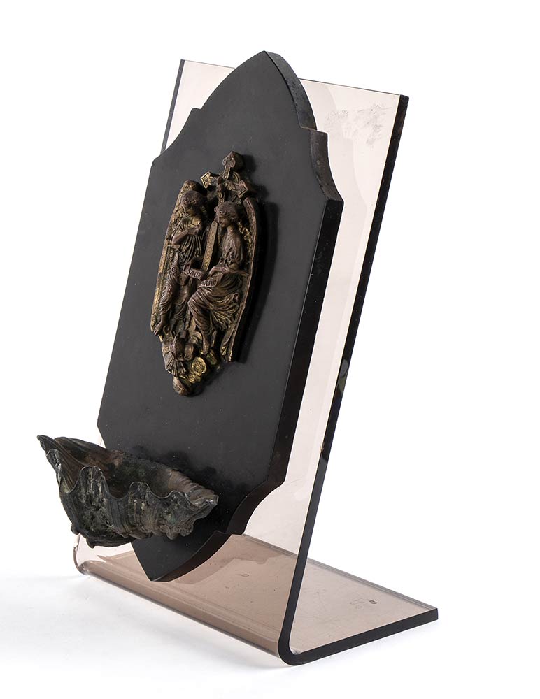 Acquasantiera su fondo nero, placchetta di bronzo con due angeli portatori della croce con cartiglio
