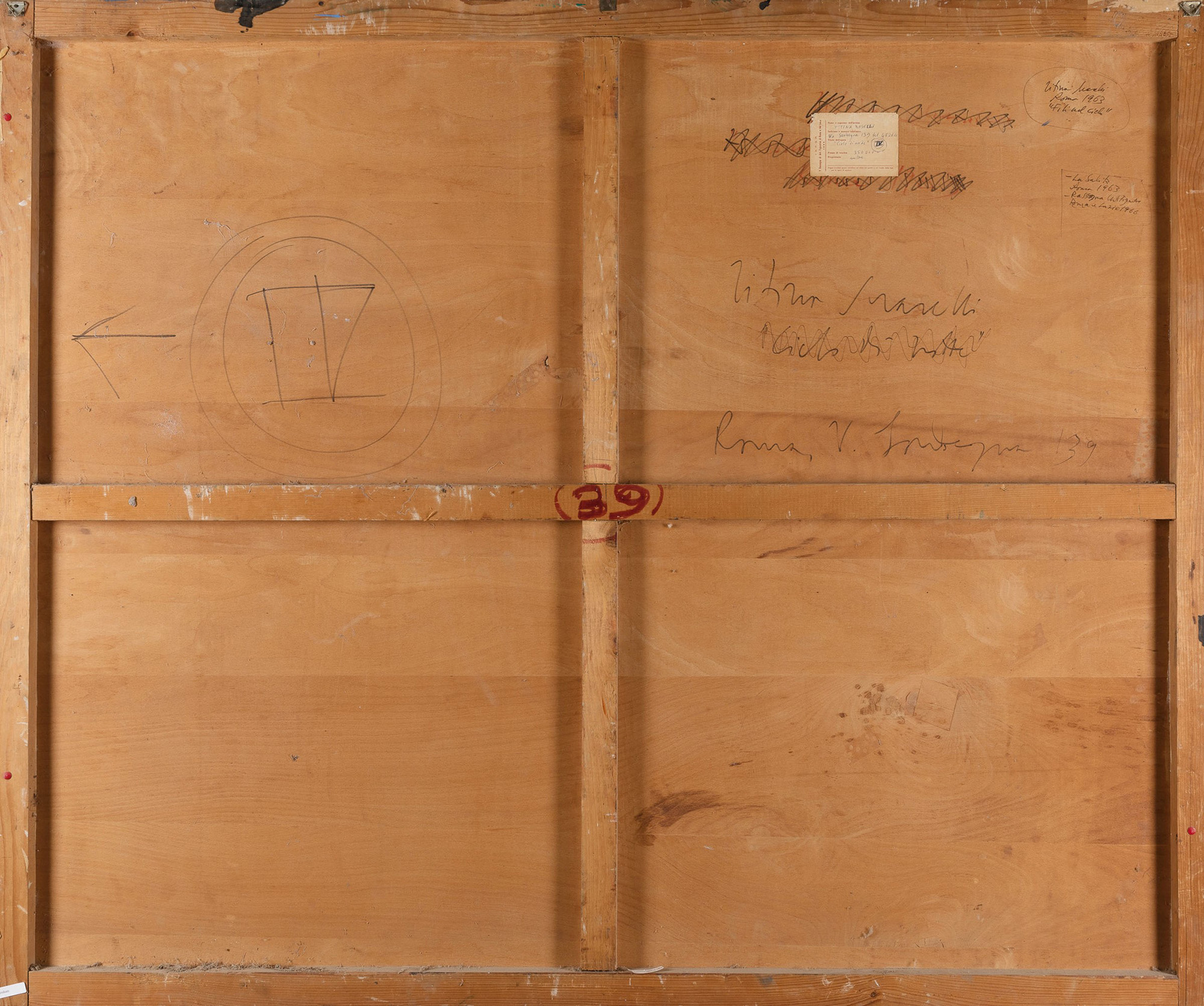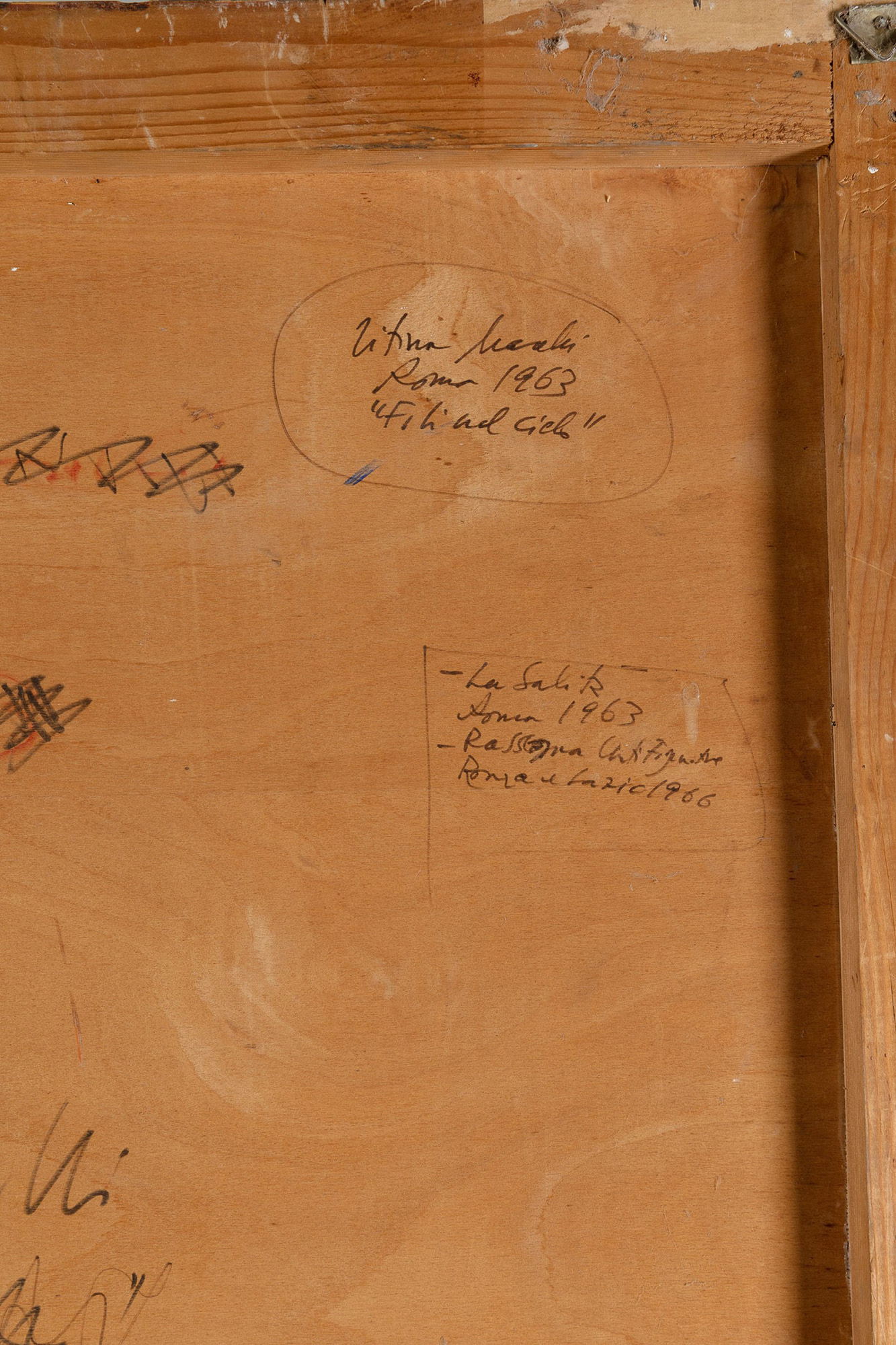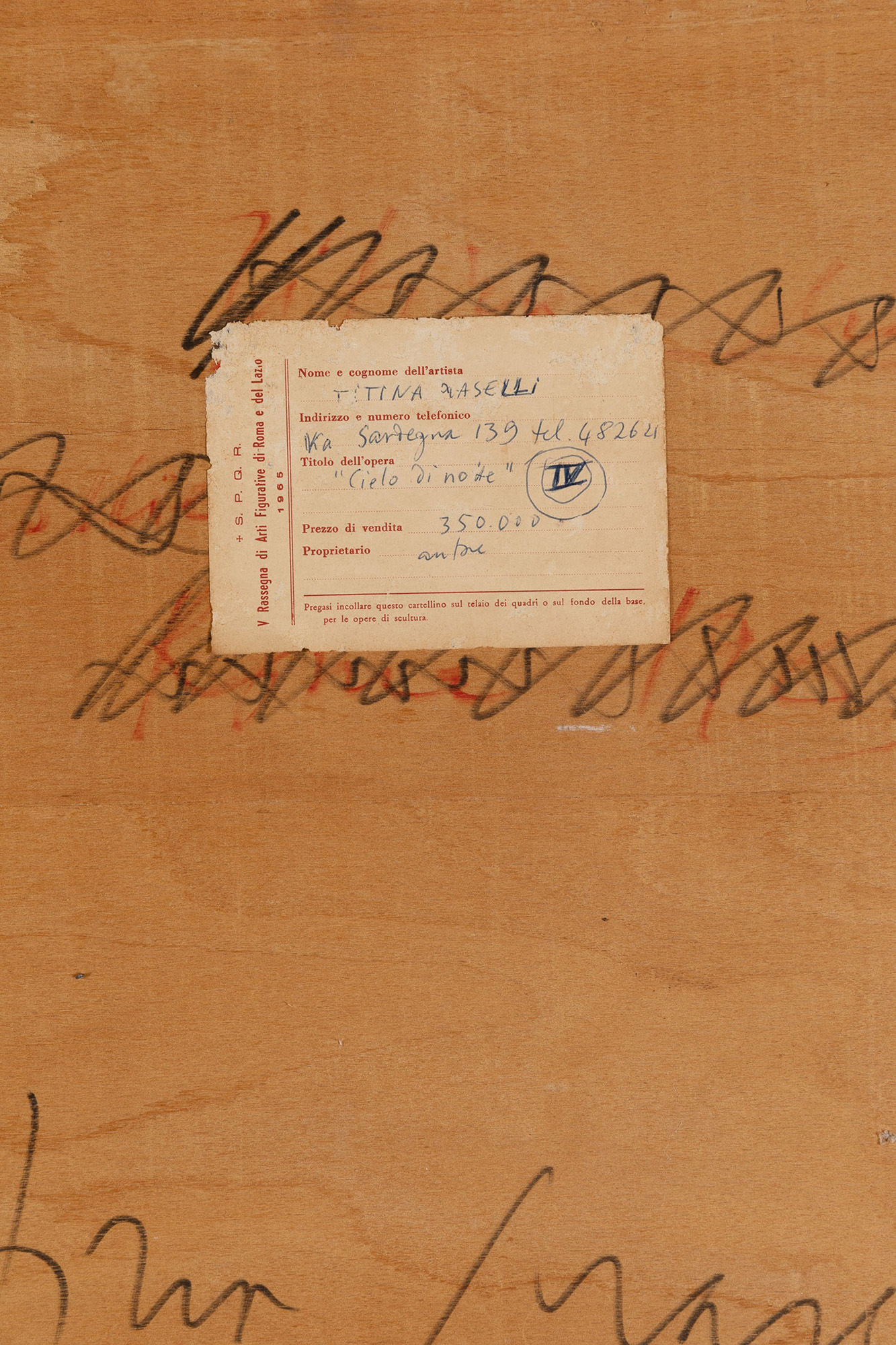 Titina Maselli (1924-2005), Cielo di notte, 1963, tecnica mista su carta applicata su tavola, cm 125x150 firmato, intitolato e datato al retro Etichetta al retro della V Rassegna di arti figurative di Roma e del Lazio. Provenienza: Collezione privata, Roma
