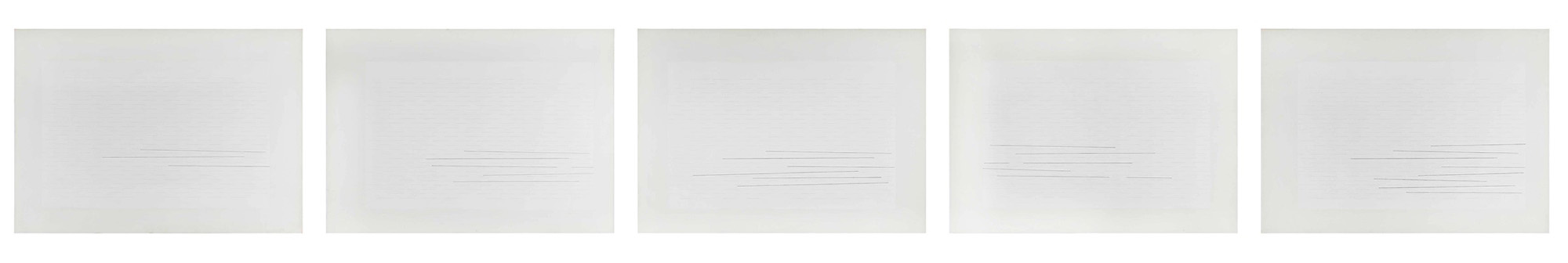 Marco Gastini (1938), Uno con cinque, 1974, acrilico, contè e pastello su carta, cm 70x503 Opera composta da 5 elementi intitolato, datato e firmato al retro Timbro al retro di Carlo Grossetti Salone Annunciata, Milano Opera registrata presso l’Archivio Marco Gastini, Torino, con il n. 1974/117 n. 0009, in data 11/04/2018