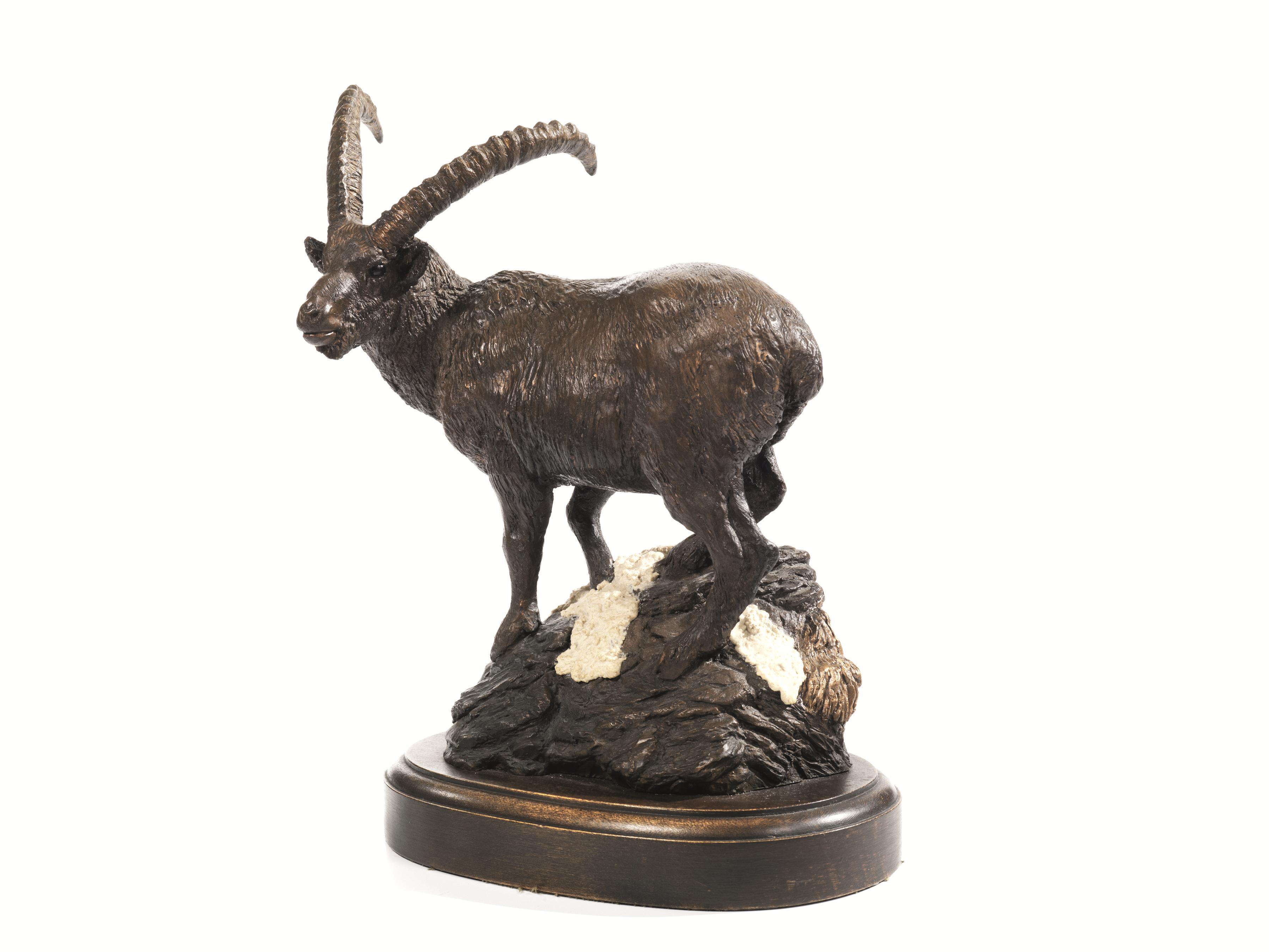 Corrado Gambotti (Torino 1922-Pavone Canavese 2011), scultura in bronzo raffigurante uno stambecco su sperone di roccia, alt. cm 23, su base in legno, firmato