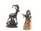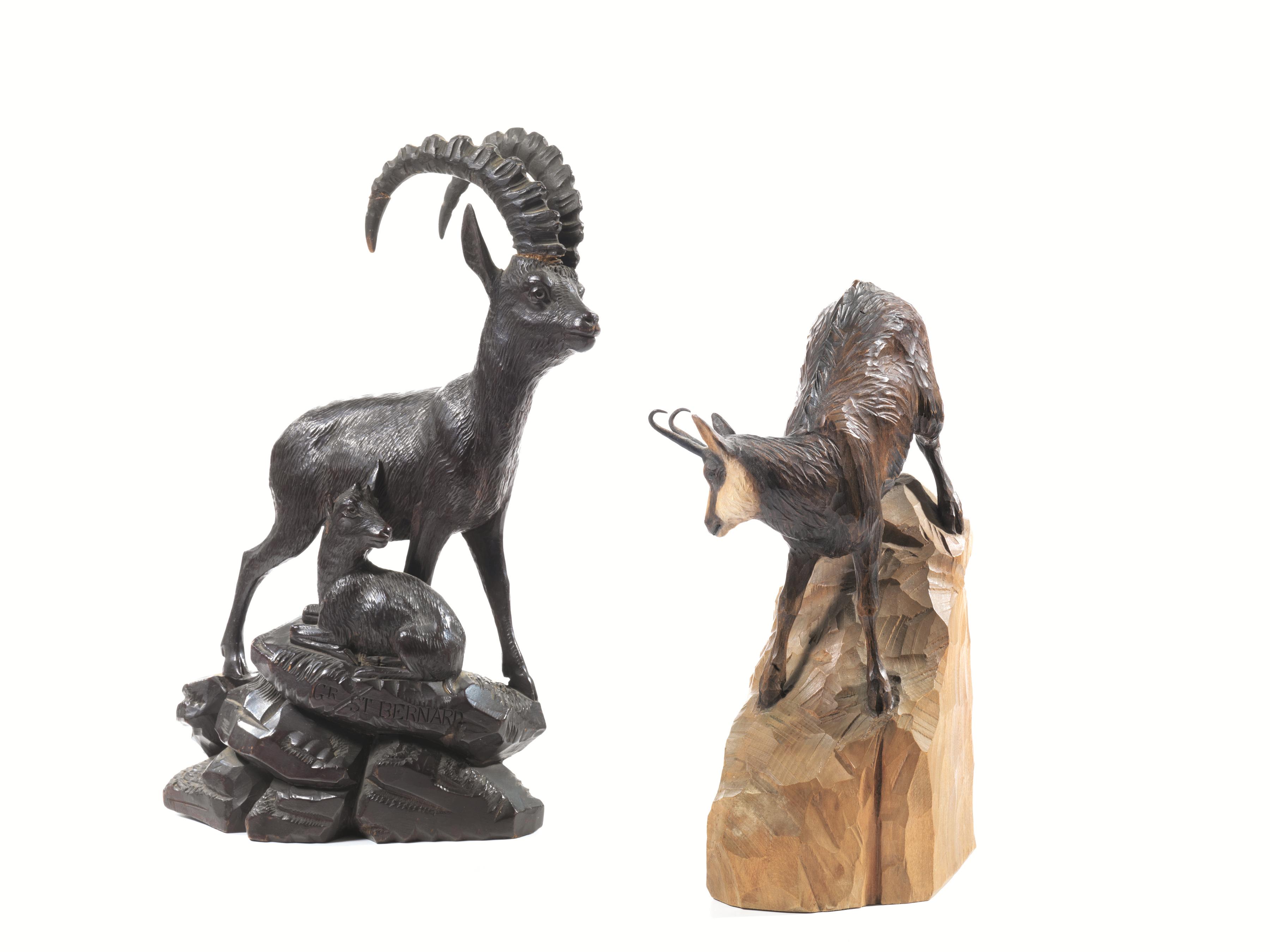 Scultura, firmata P.Pfeifhofer 1986, in legno intagliato a camoscio, alt. cm 25 ed altra scultura, in legno intagliato a stambecco con cucciolo, con iscrizione su sperone di roccia GR/St Bernard, alt. cm 32 (2)