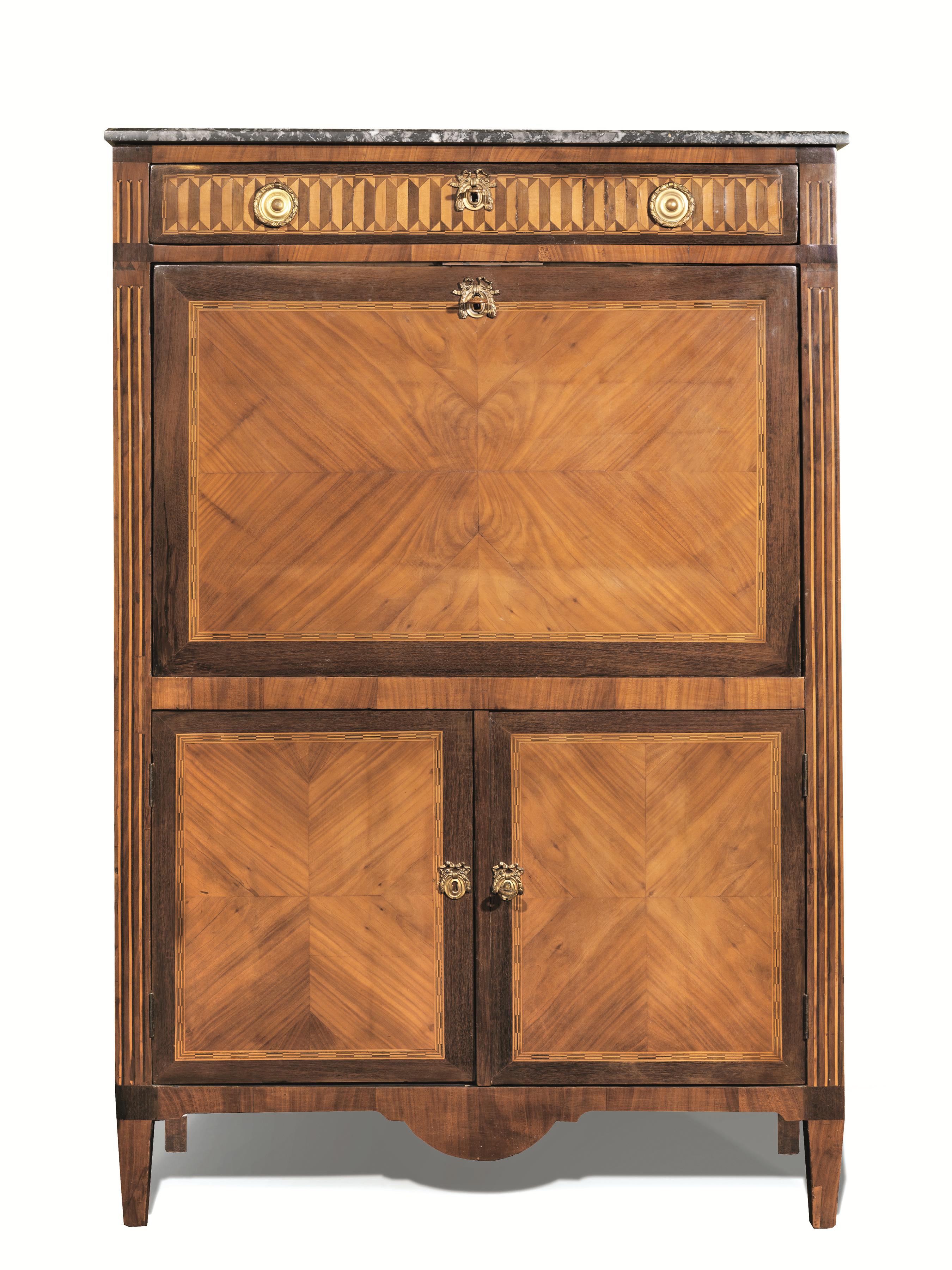 Secretaire, Francia, fine sec. XIX, in palissandro e bois de rose intarsiati a motivi geometrici, piano rettangolare in breccia di marmo grigio, un cassetto sotto al piano, sportello a calatoia, due sportelli sottostanti, gambe troncopiramidali, cm 93x37x14, presenta modifiche allo scarabattolo