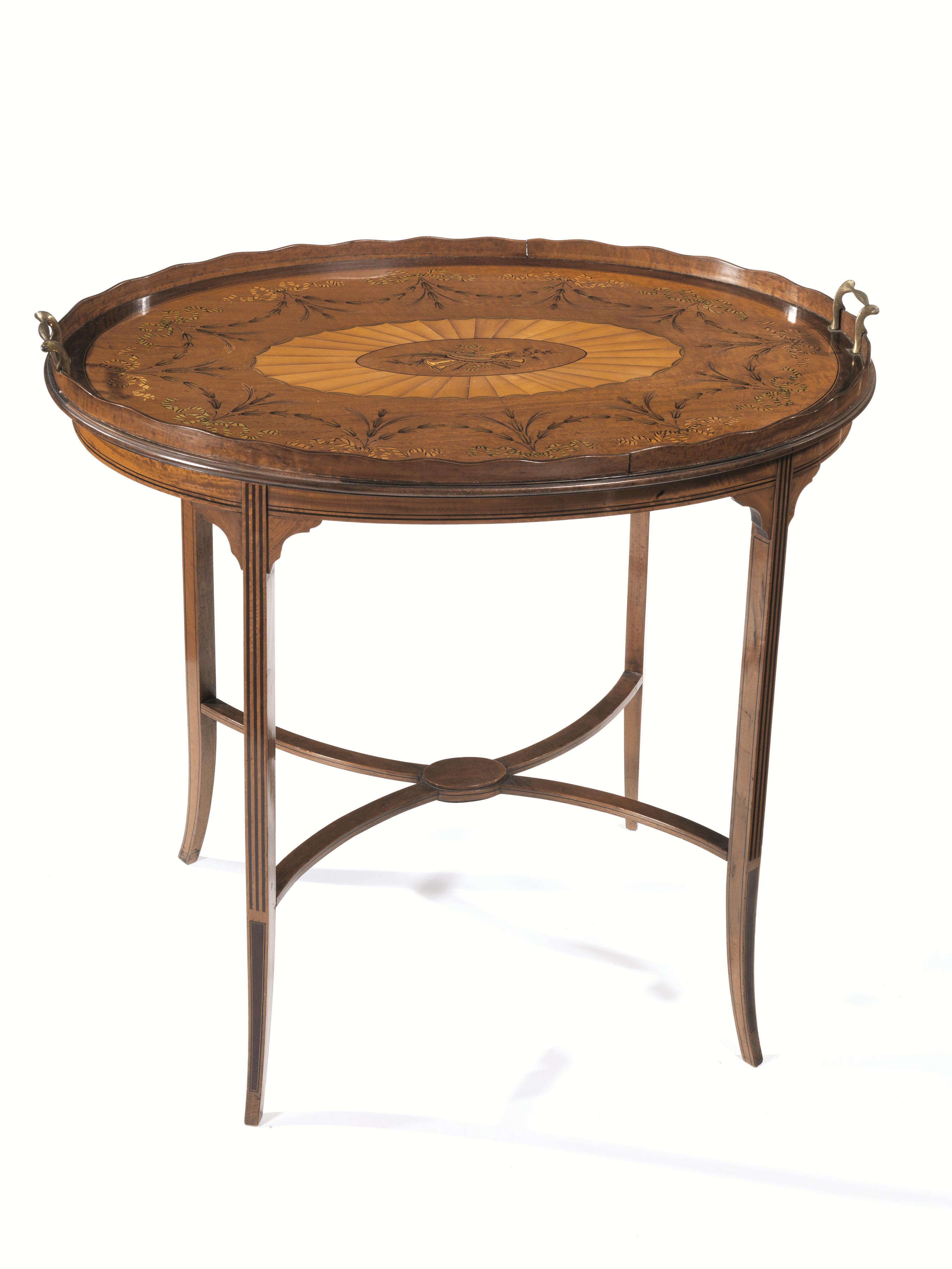 Tavolino, Inghilterra, inizi sec. XX, in satin wood intarsiato e dipinto, piano ovale a vassoio, gambe a sciabola riunite da crociera, cm 81x55x72