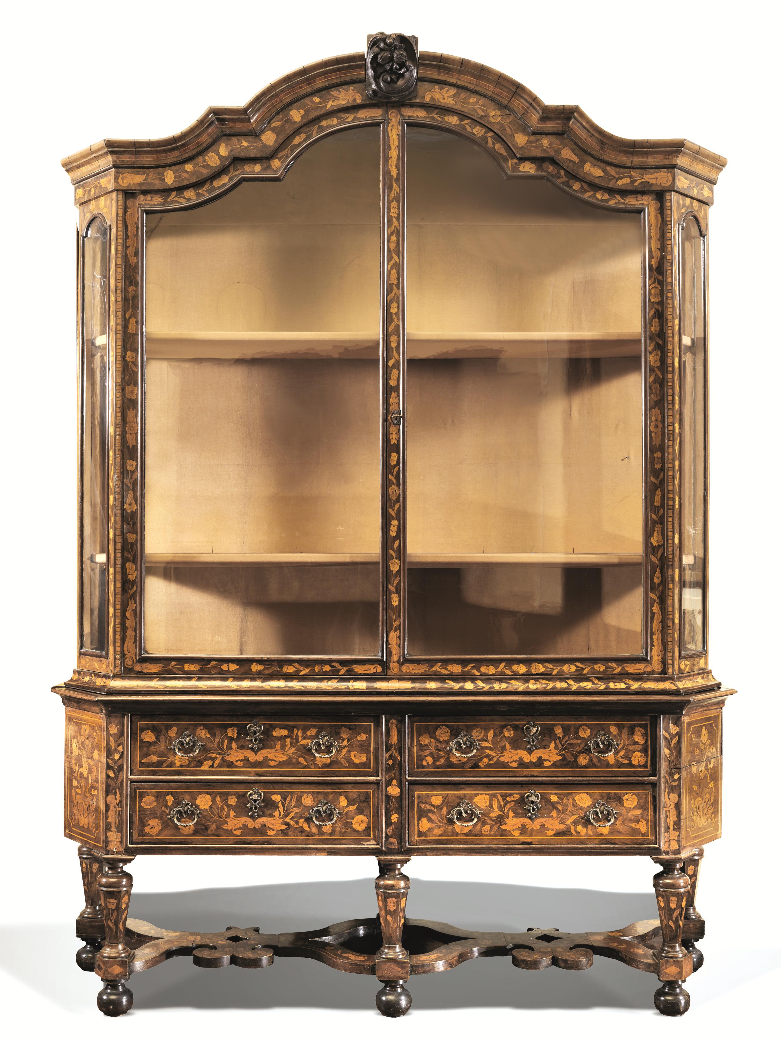 Mobile vetrina, Olanda, metà sec. XVIII, in noce intarsiato a motivi floreali, cappella sagomata, due sportelli a vetri e quattro cassetti nella base, gambe a balaustro riunite da crociera, piedi a palla, cm 166x49x234, piccoli danni e mancanze