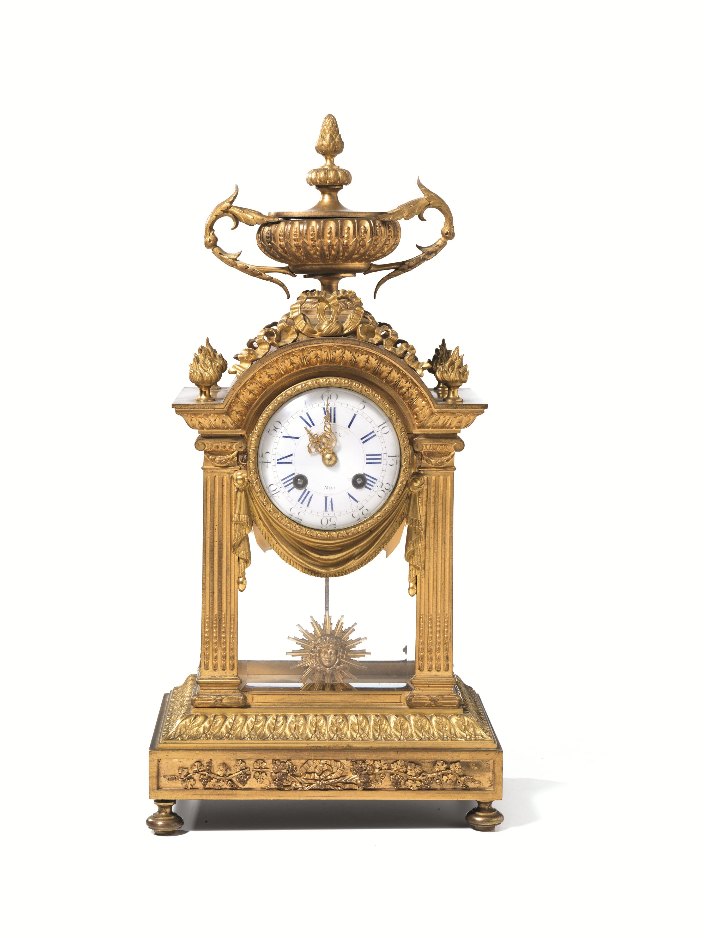 Orologio da tavolo, Francia, sec. XVIII, in bronzo dorato, cassa con cimasa semicircolare sormontata da un vaso biansato, quadrante in smalto firmato Schmitz - Nice, alt. cm 47, meccanismo da revisionare