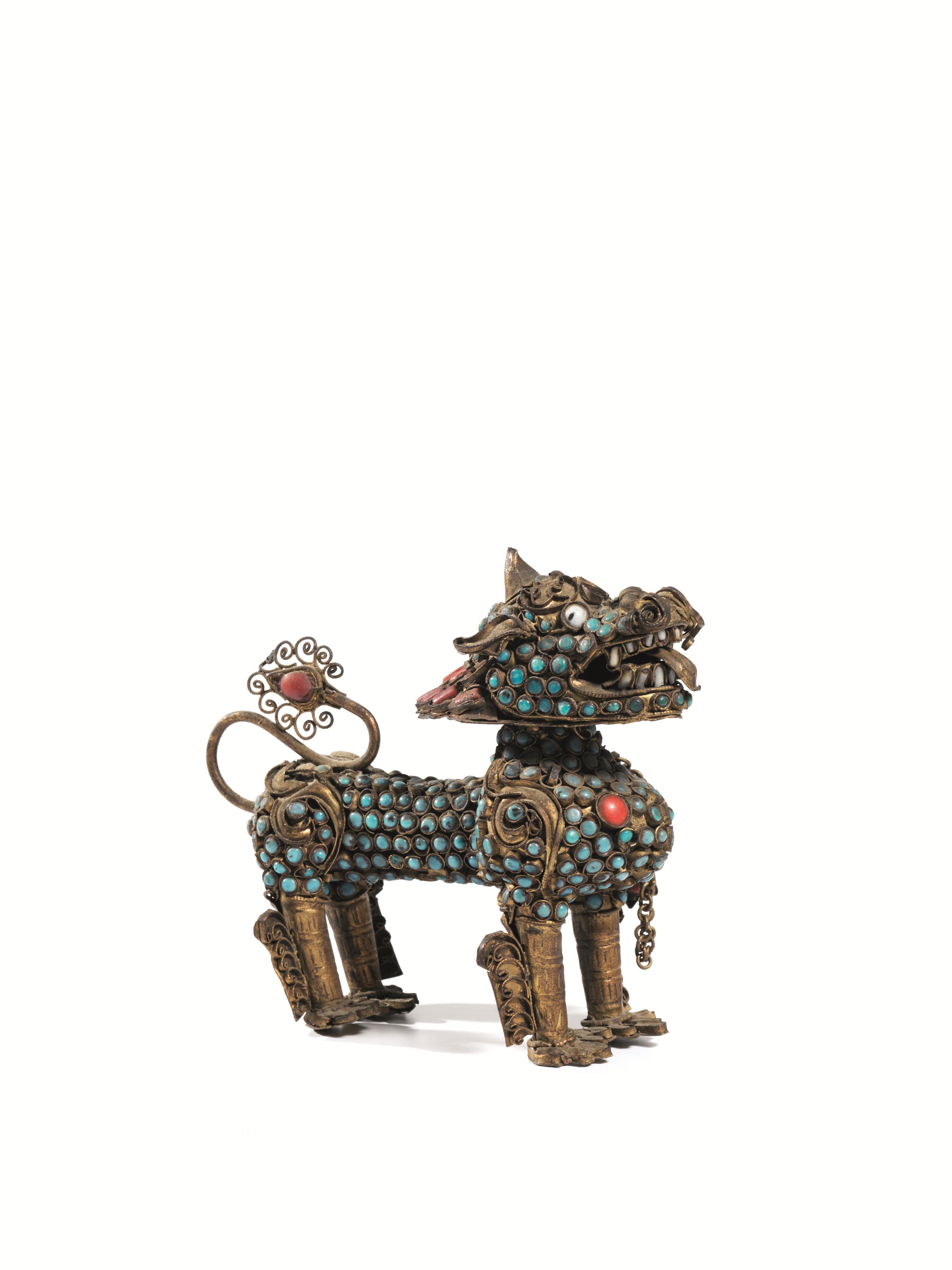 Cane di Fo, Cina o Tibet, sec. XVIII-XIX, in metallo dorato con incastonati turchesi e pietre dure, cm 12x11, lievi mancanze