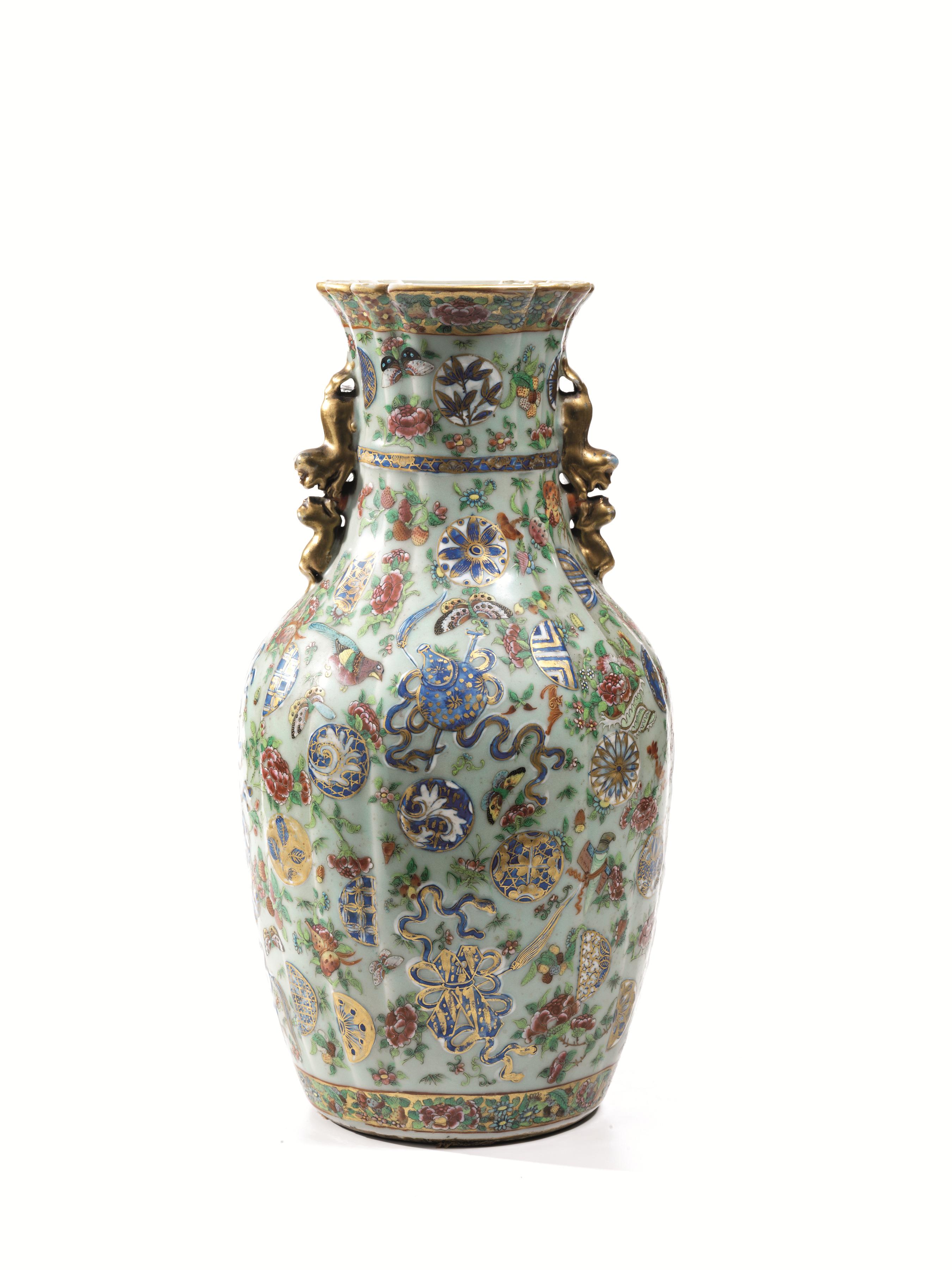 Vaso, Cina, sec. XIX, in porcellana policroma decorato con motivi floreali, volatili e festoni, sul collo due applique con leoni che si affrontato, alt. cm 43