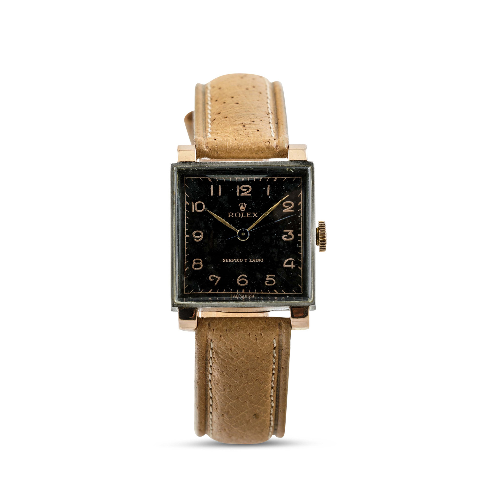 ROLEX - "Serpico y Laino" di forma Carrè ref. 3535 con cassa in acciaio e oro rosa 18k, quadrante nero gilt con numeri Breguet e firma rivenditore. Marchio/Brand: Rolex