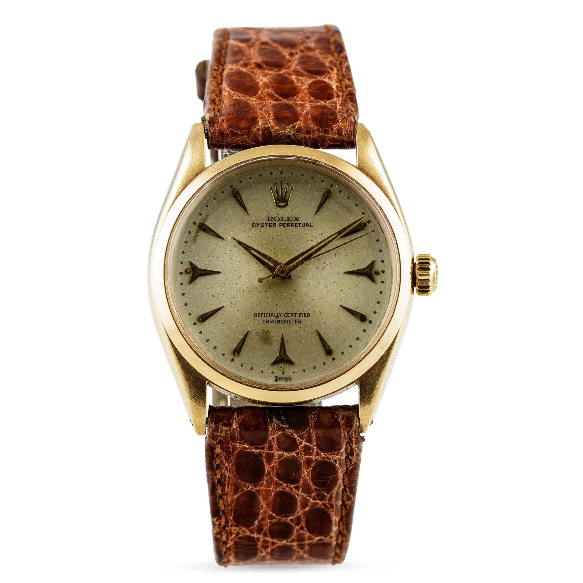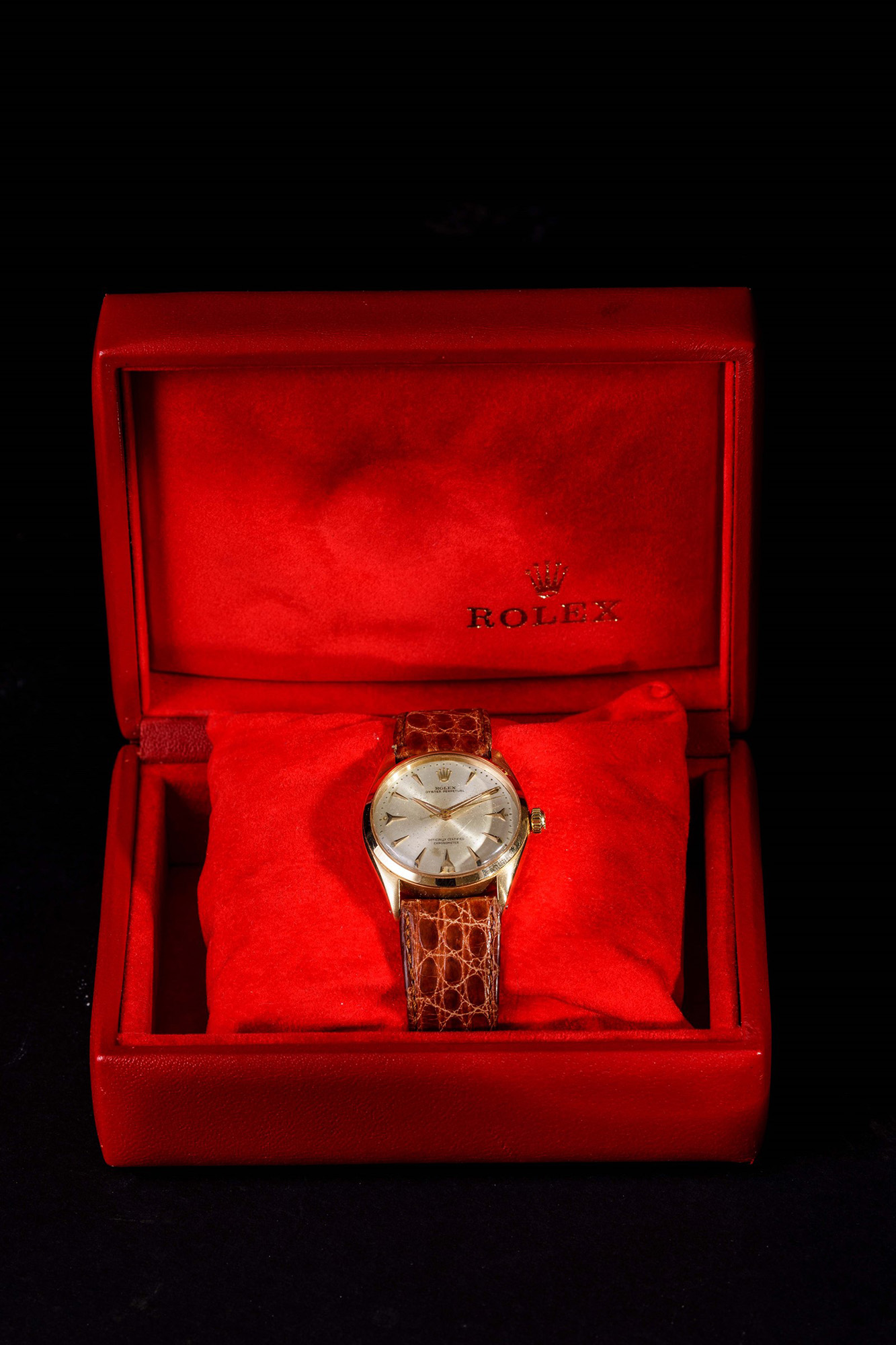 ROLEX - Oyster Perpetual ref 6564, oro 18k, quadrante argentè e sfere dauphine, anni '50.