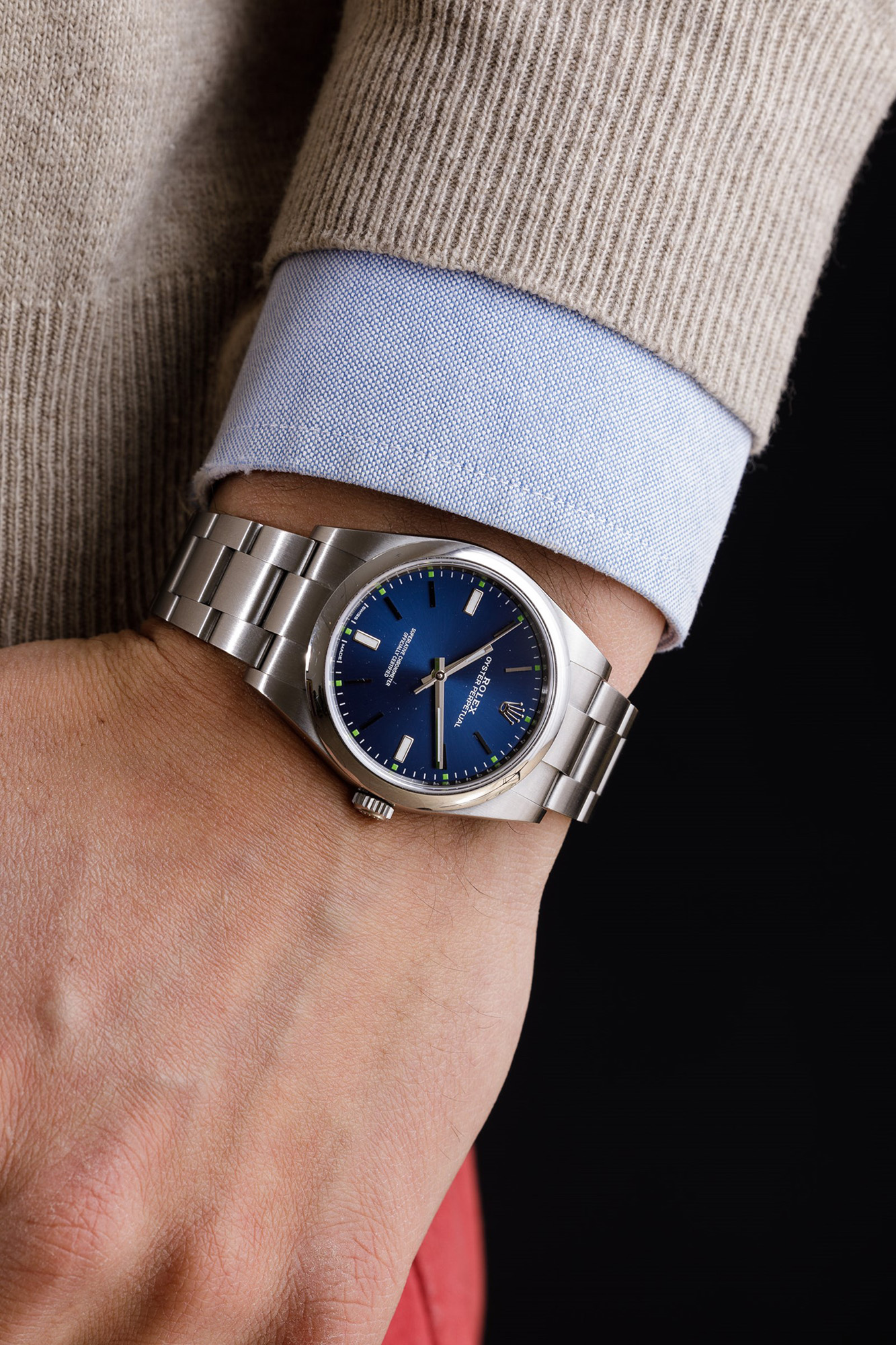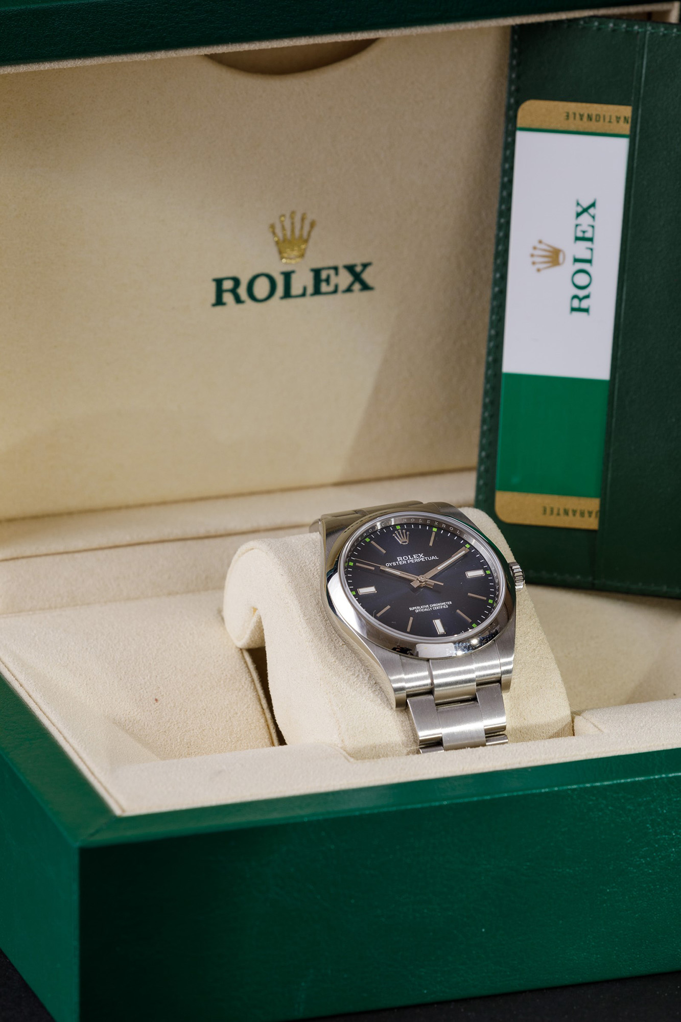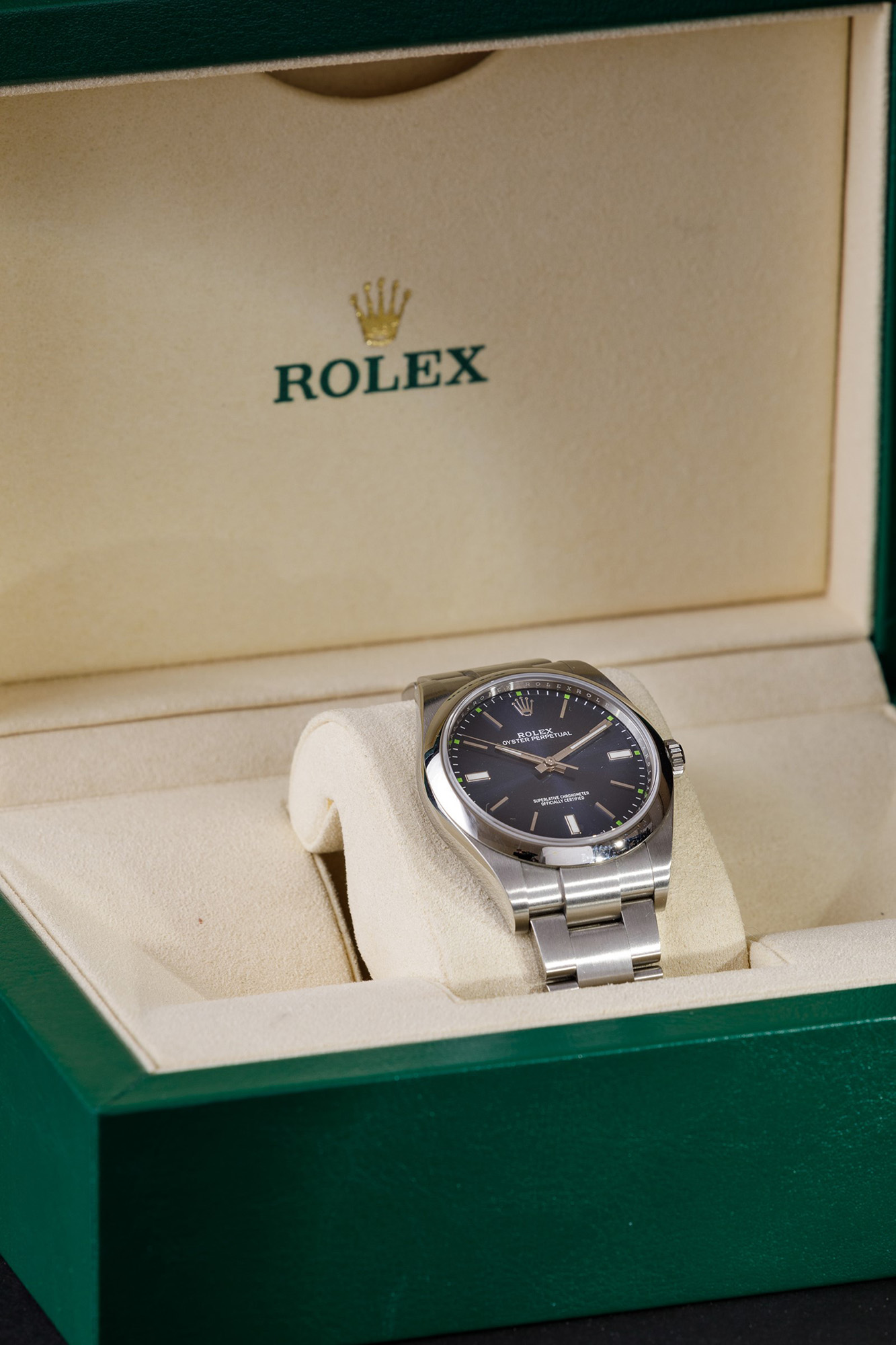 ROLEX - Oyster Perpetual ref 114300, Oyster acciaio, quadrante blu radiale con piccoli indici verdi, 2019.
