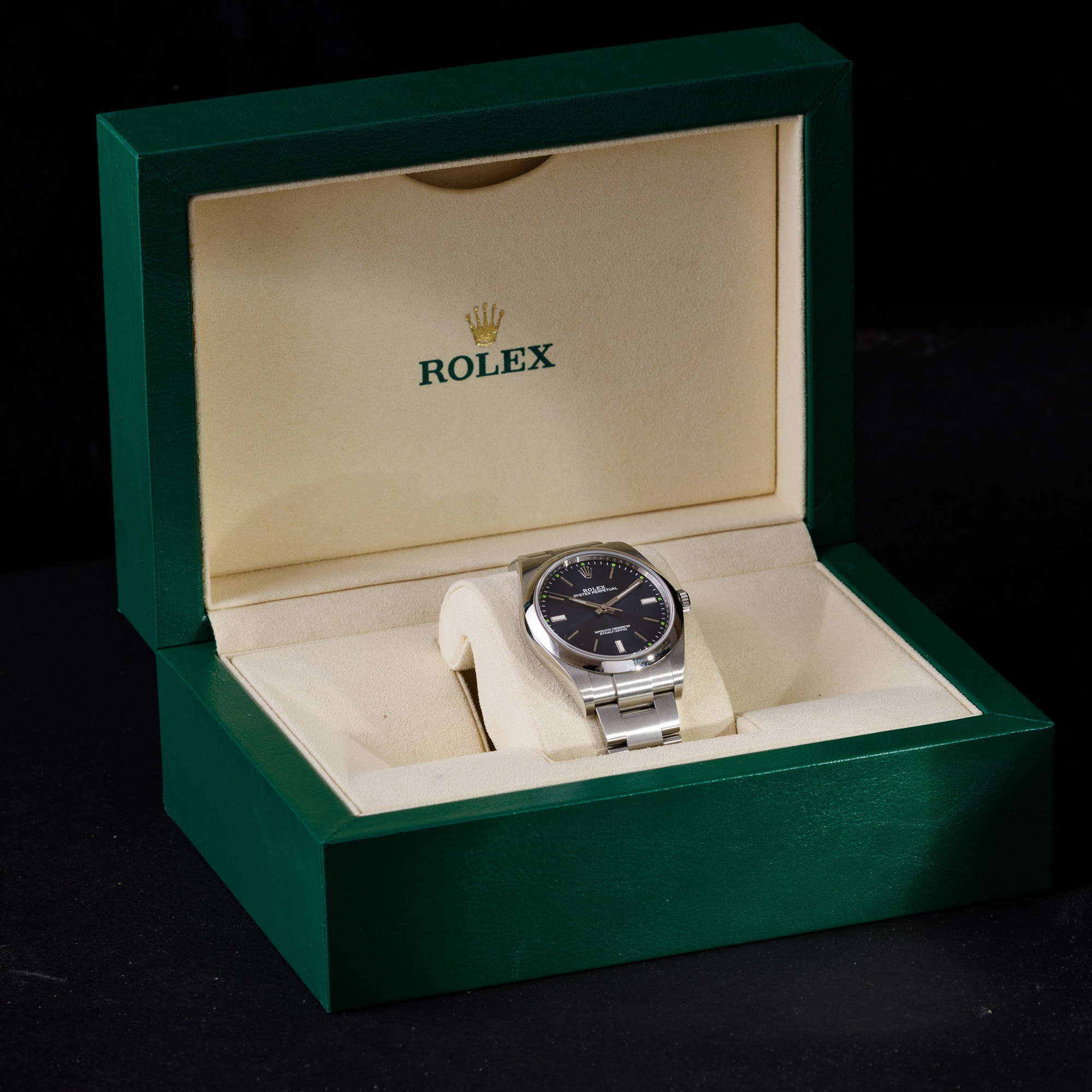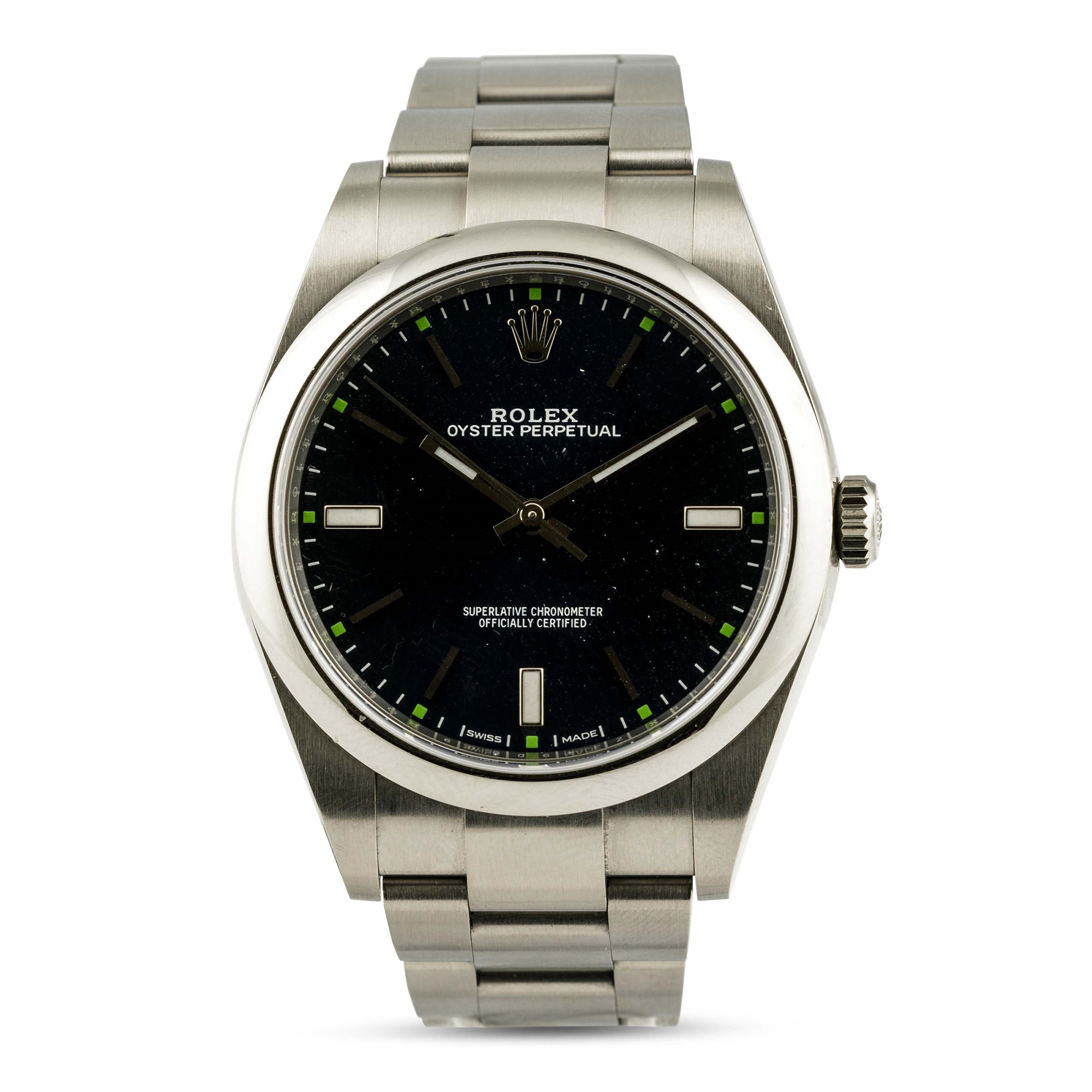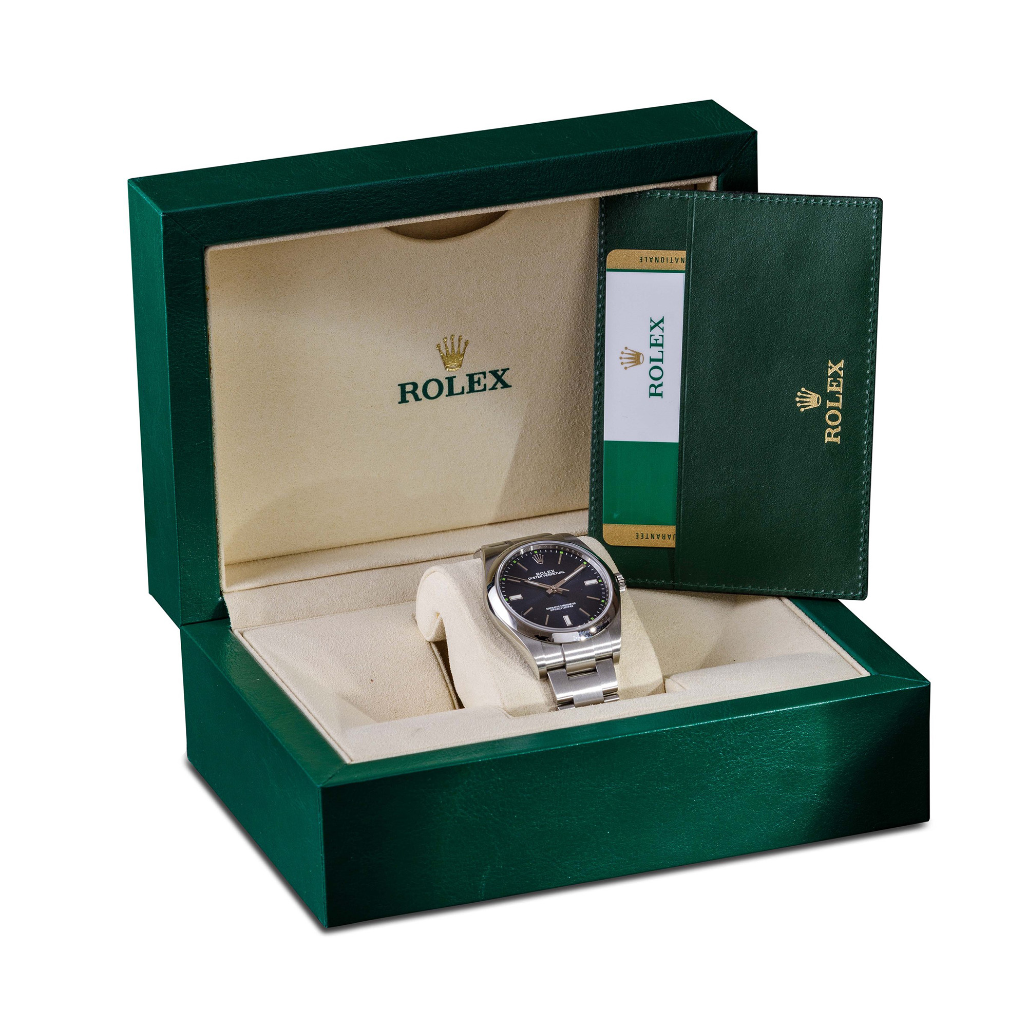 ROLEX - Oyster Perpetual ref 114300, Oyster acciaio, quadrante blu radiale con piccoli indici verdi, 2019.