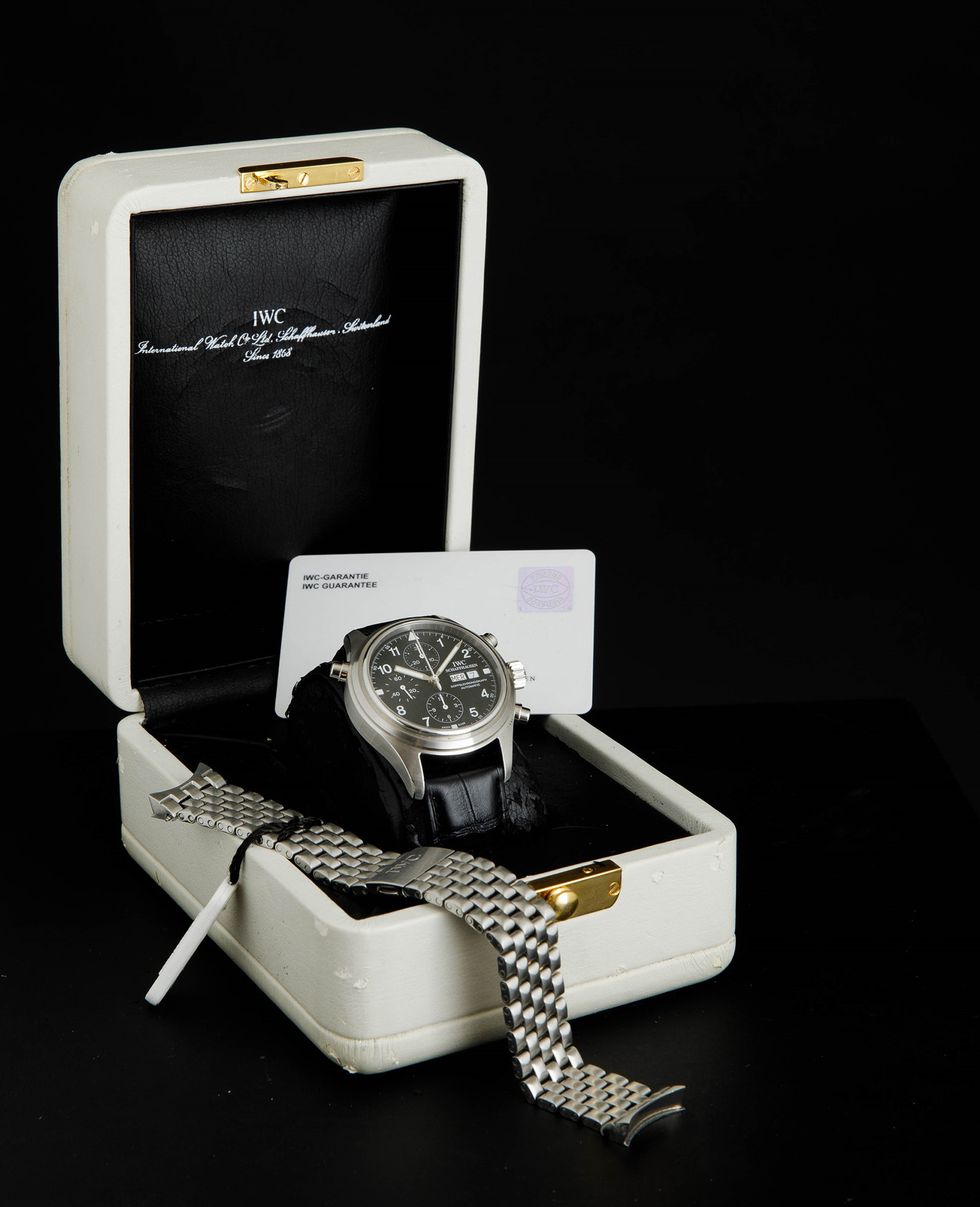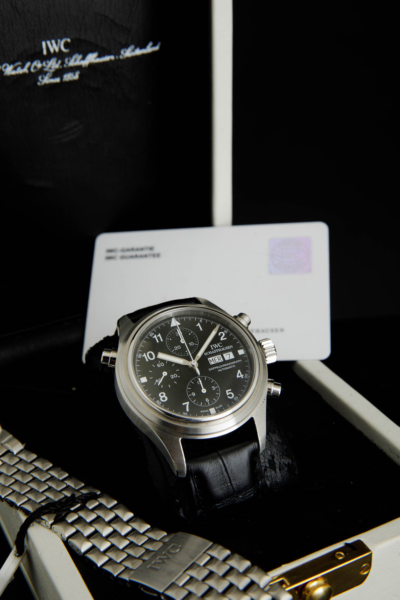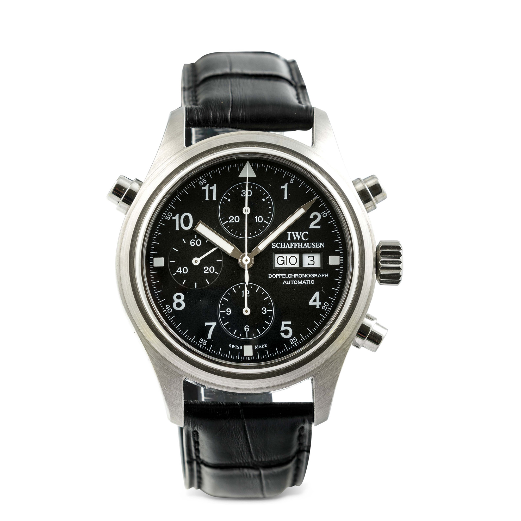 IWC - Doppelchronograph ref 3711, cronografo rattrappante con giorno e data in acciaio. Accompagnato da scatola e garanzia, circa 2000. Marchio/Brand: IWC