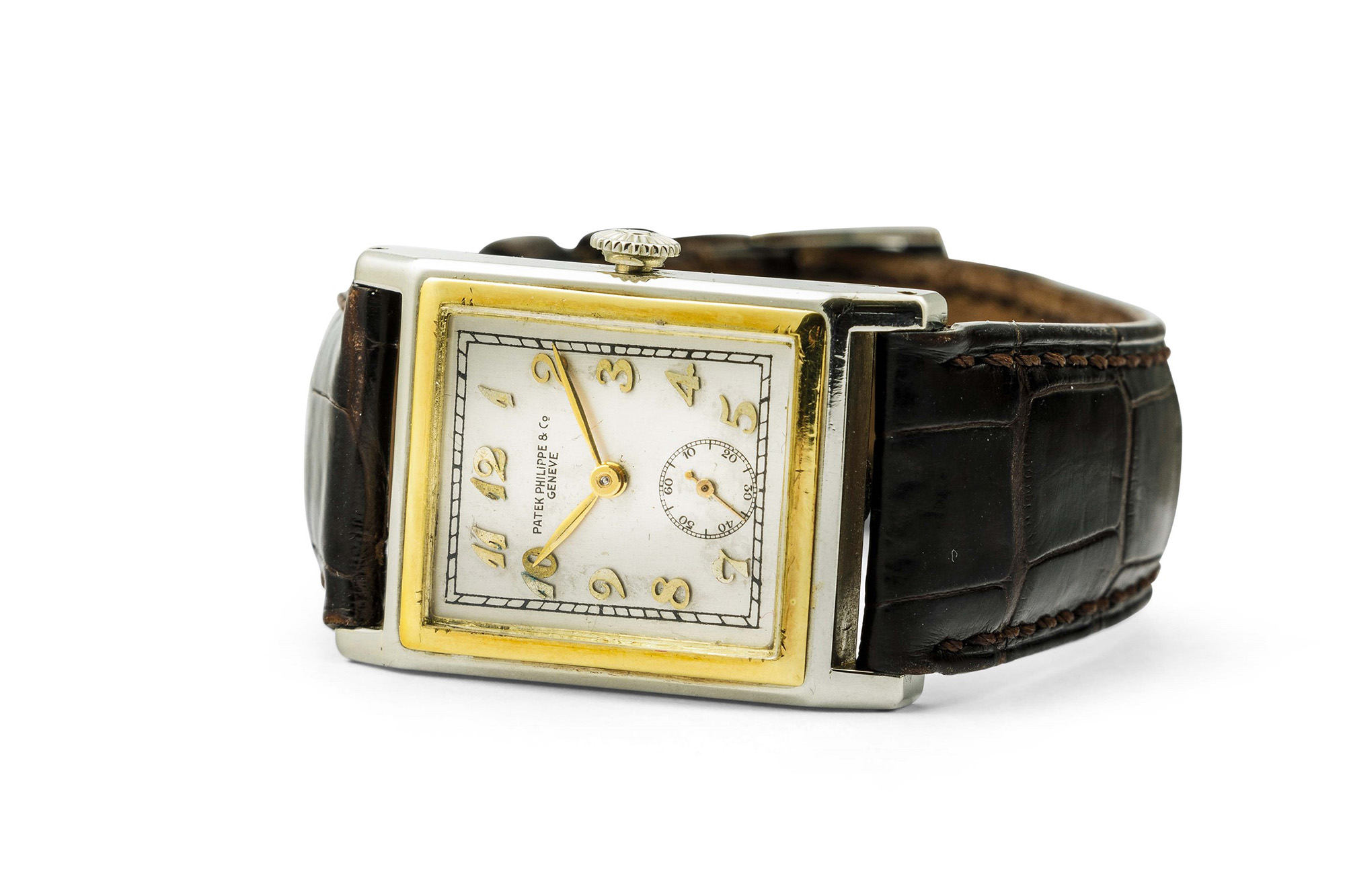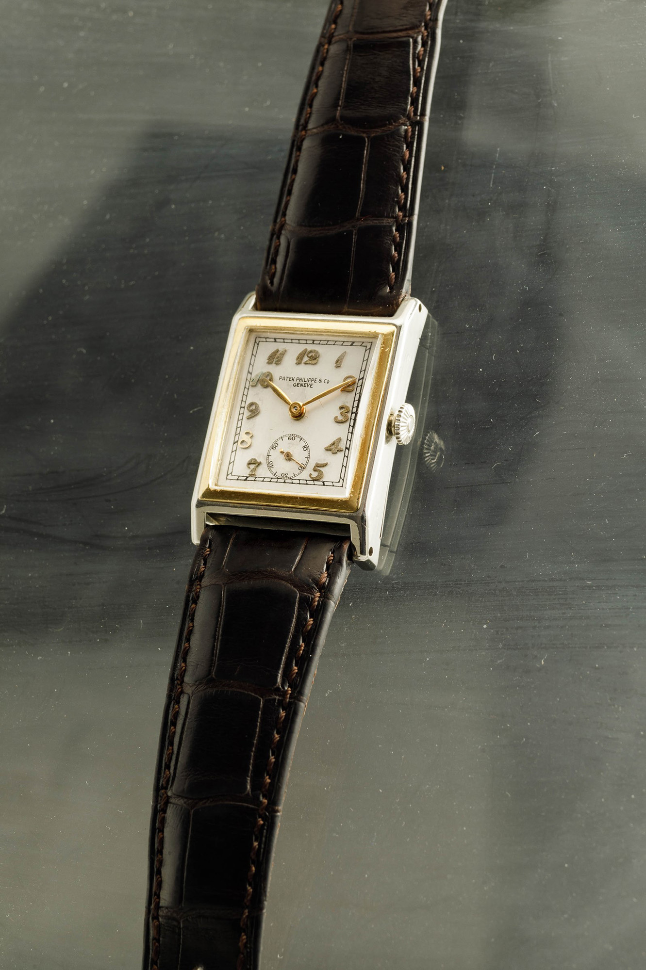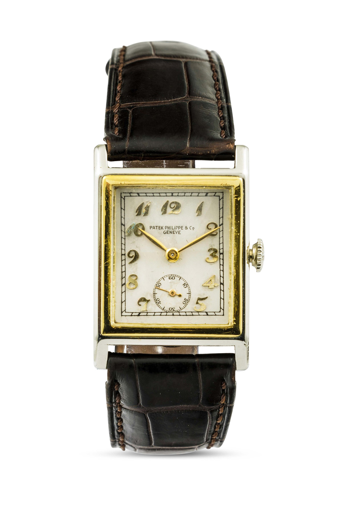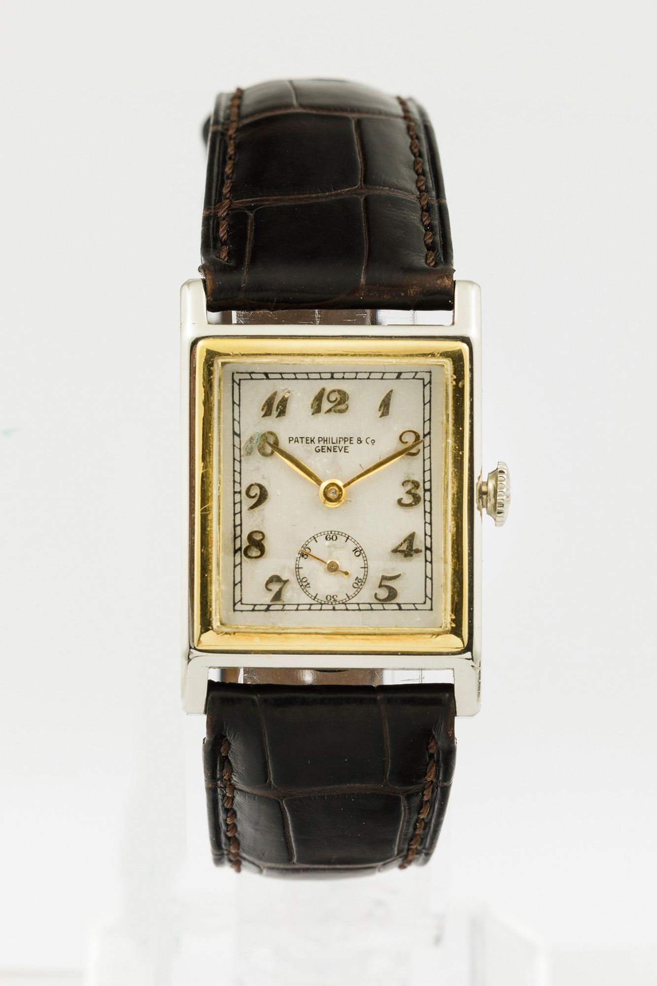 PATEK PHILIPPE - Raro orologio di Forma anni '30 con cassa d'oro 18k bitonale. Con scatola ed Estratto d'Archivio