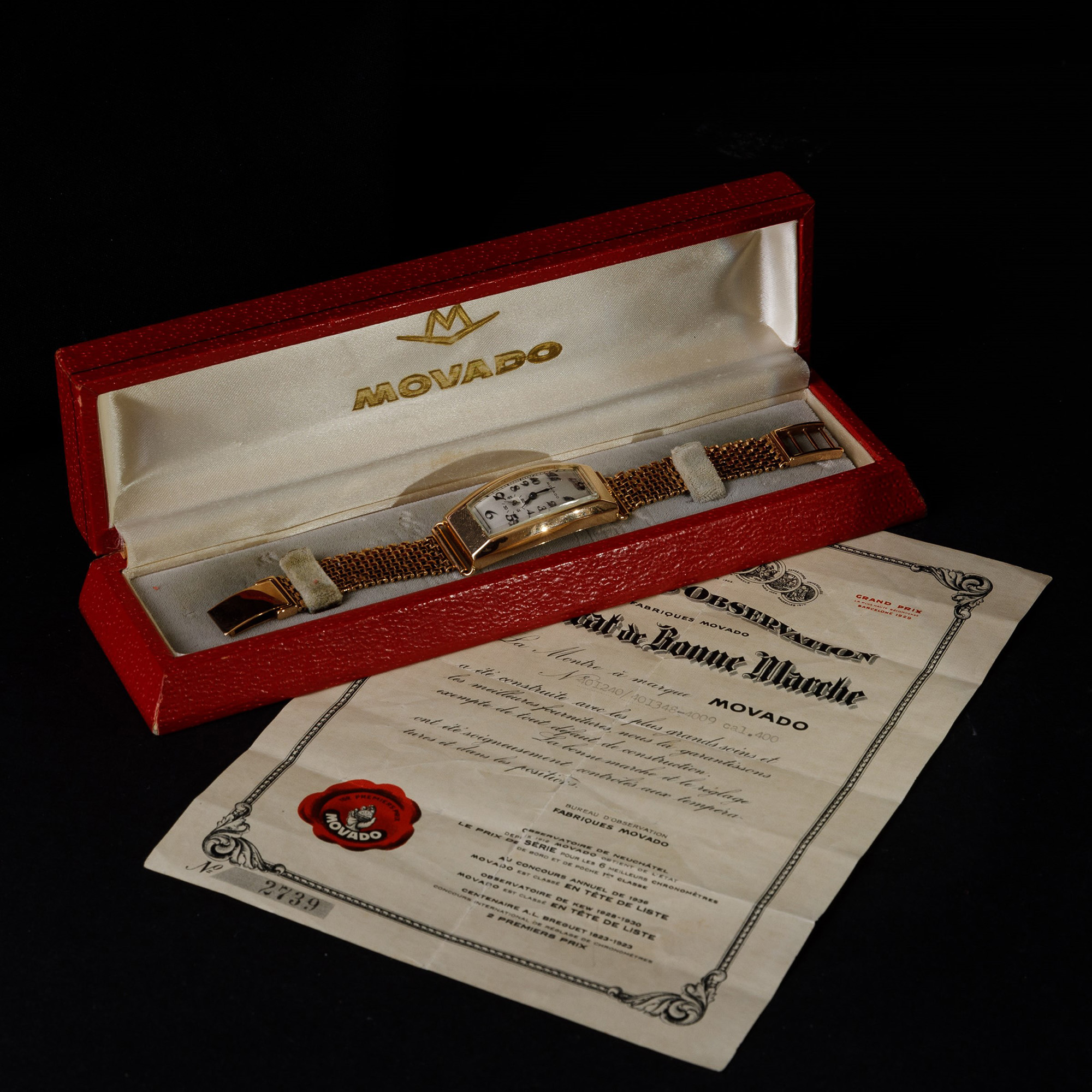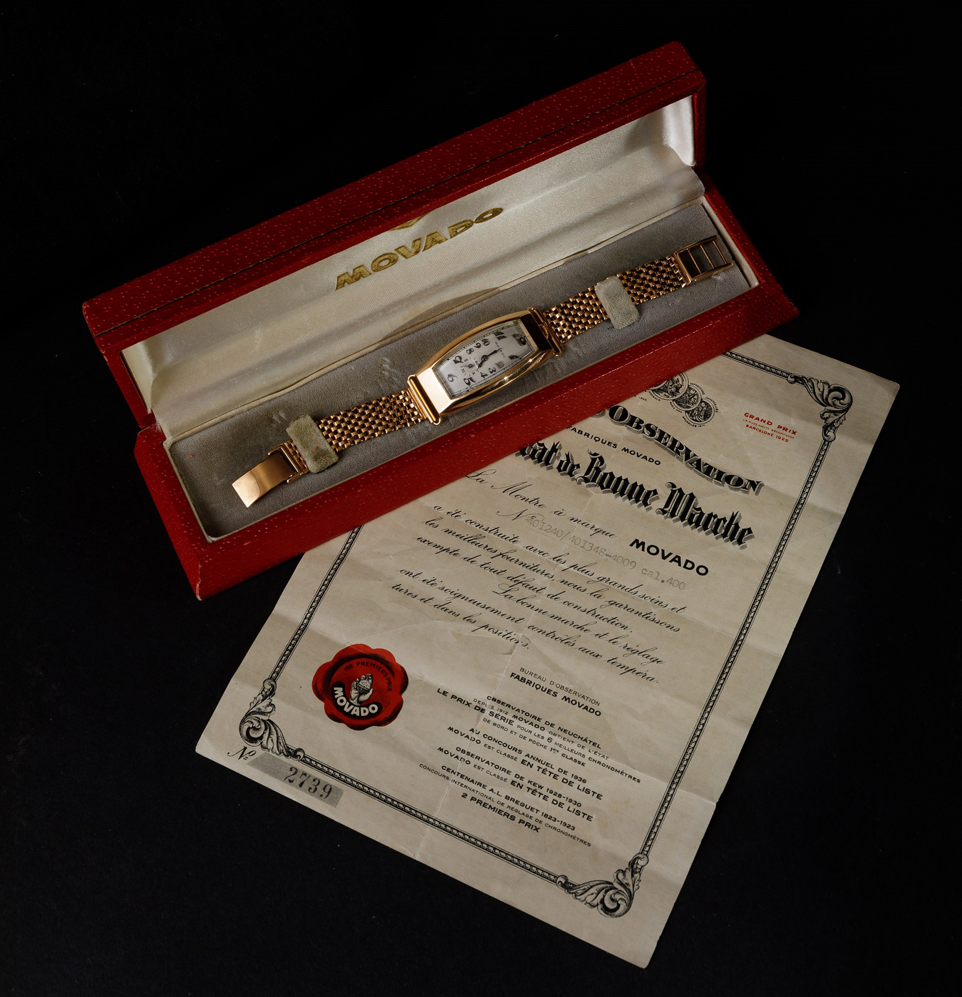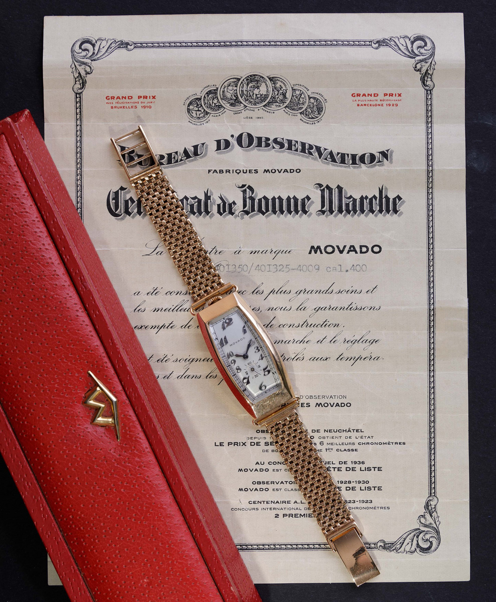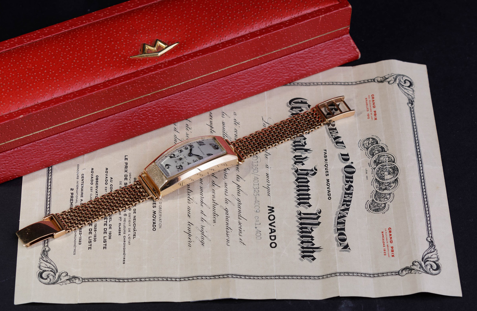 MOVADO - Polyplan con cassa curvex in oro rosa 18k, secondi in basso. Accompagnato da astuccio originale e certificato dell'epoca. Marchio/Brand: Movado