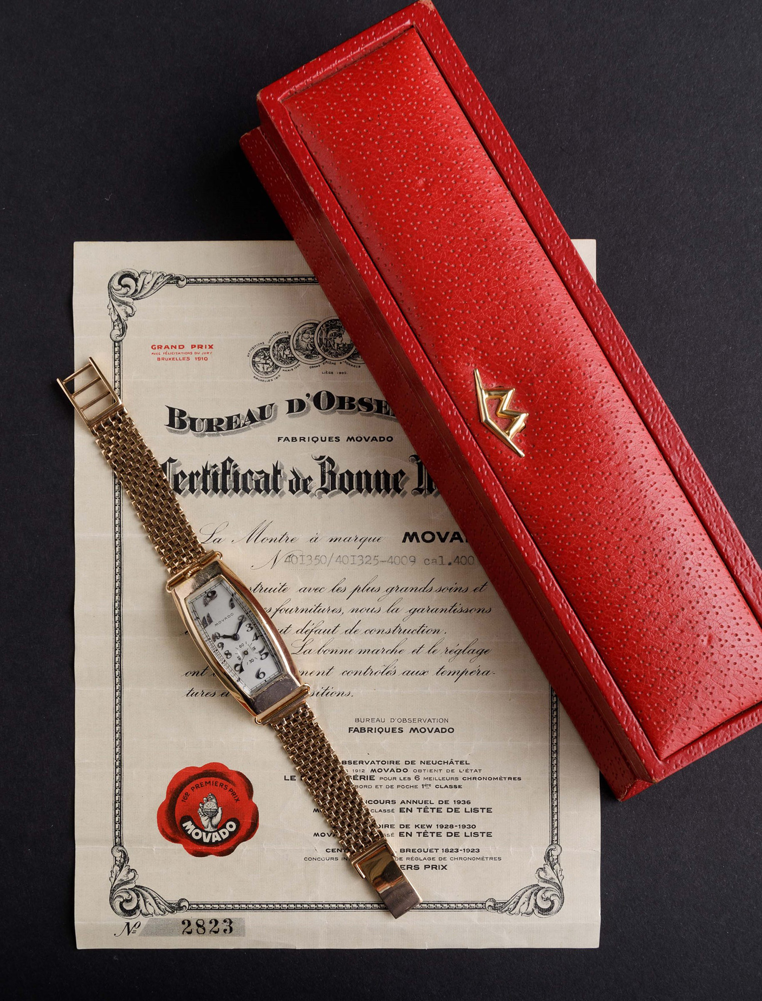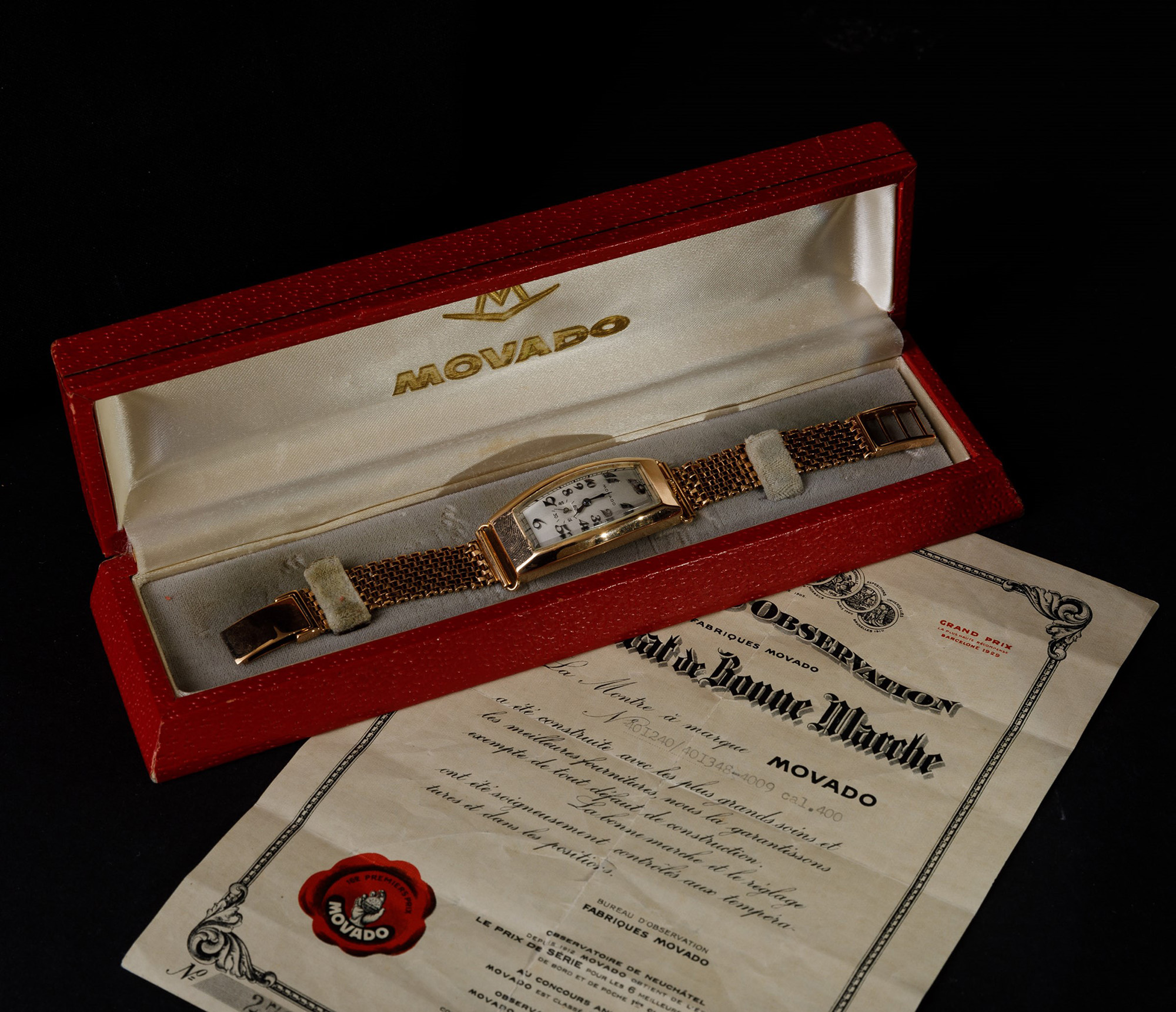 MOVADO - Polyplan con cassa curvex in oro rosa 18k, secondi in basso. Accompagnato da astuccio originale e certificato dell'epoca