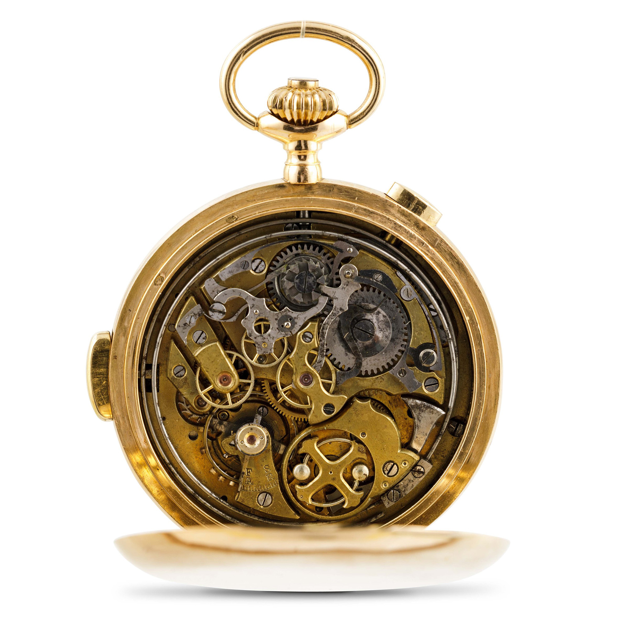 Orologio da tasca con tripla cassa in oro 18 k con ripetizione ore, quarti e minuti con cronografo, quadrante in smalto bianco e numeri Breguet. Anno/Year: circa 1906