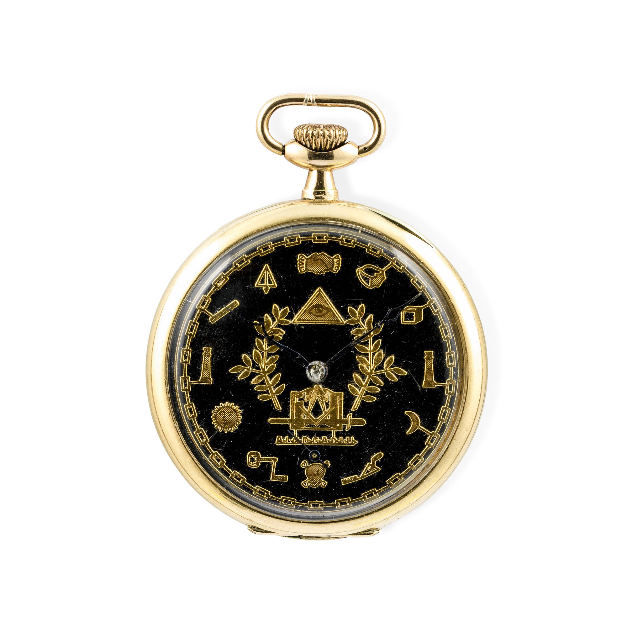 Orologio da tasca massonico carica remontoir cassa tre corpi in oro 14k con couvette in metallo dorato. Anno/Year: 1930